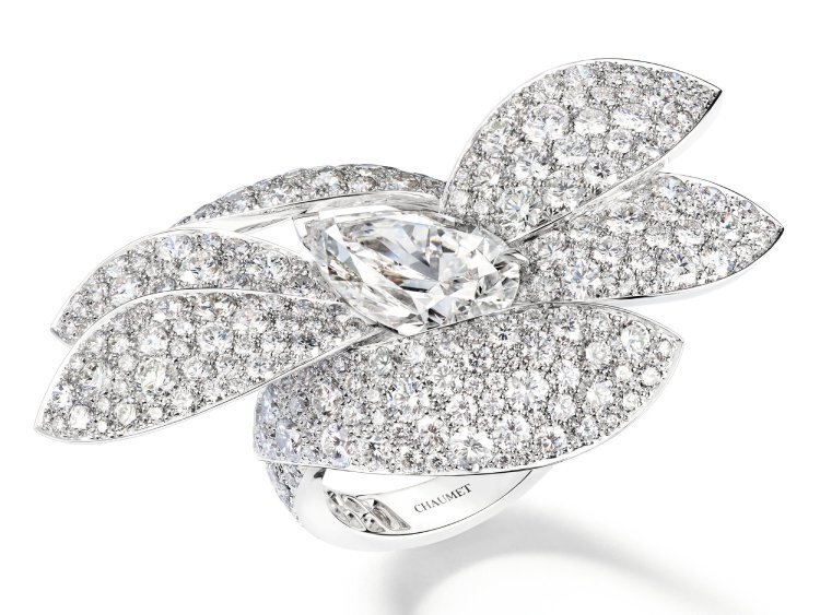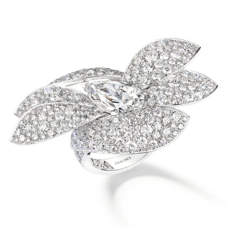 The large, unfurling pointed petals of the magnolia are crafted from white gold and paved with round brilliant-cut diamonds, creating a shimmering play of light. The focal point is a central pear-cut diamond set as the pistil, its lively and brilliant sparkle revealing a vibrant vitality.