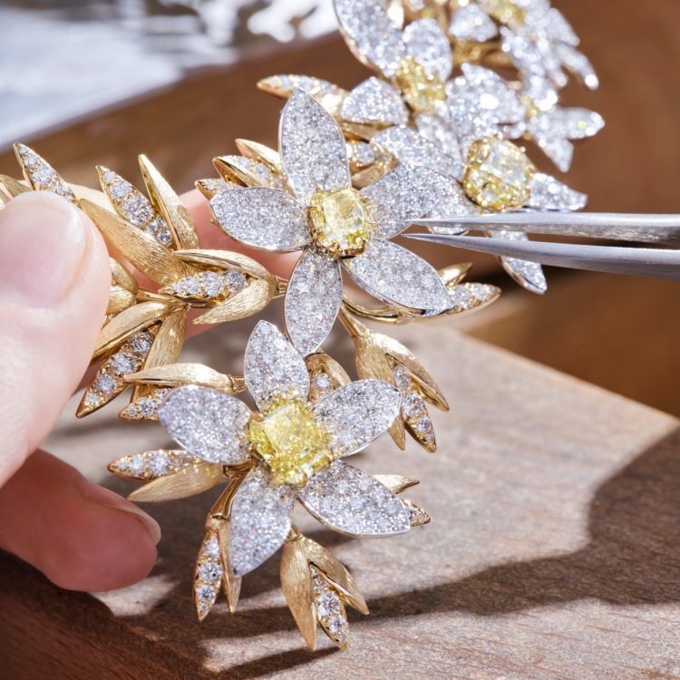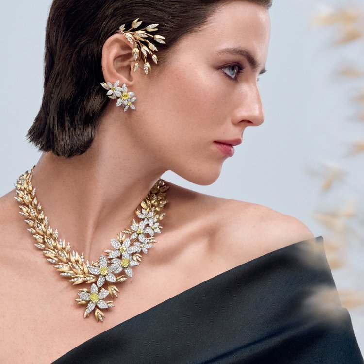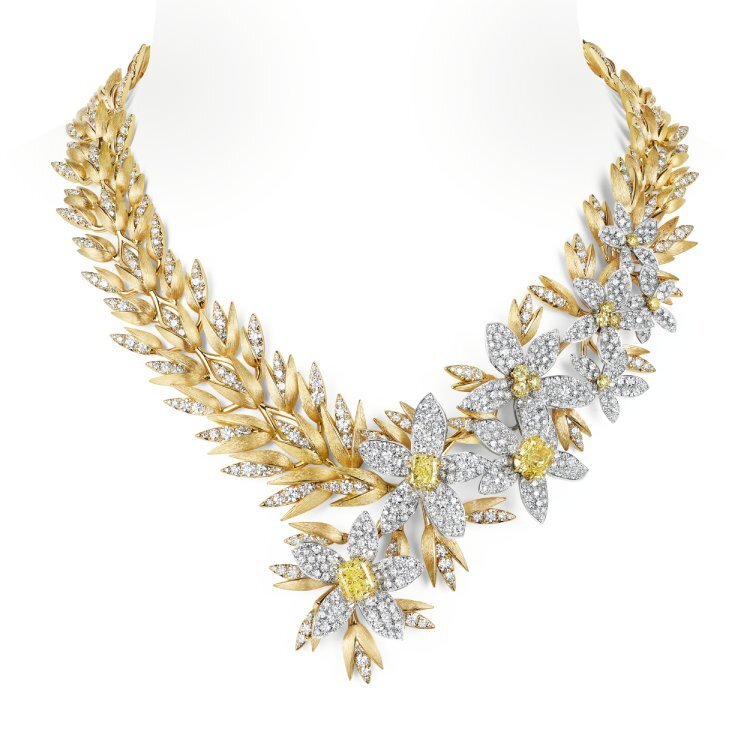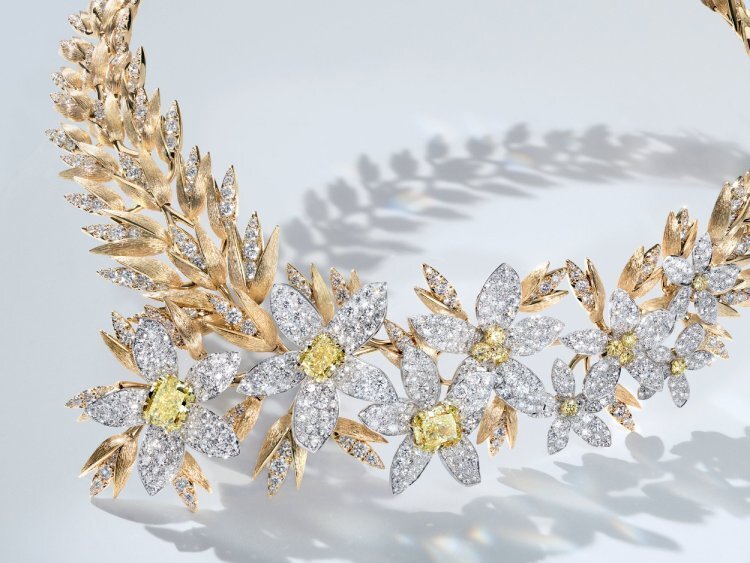 - Necklace: Asymmetrically structured with layered hinged golden oats on one side and eight blooming field stars on the other, three featuring pillow-cut yellow diamonds weighing 3.37ct, 2.87ct, and 2.08ct. Nearly 1,300 hours of meticulous craftsmanship went into creating this masterpiece.
