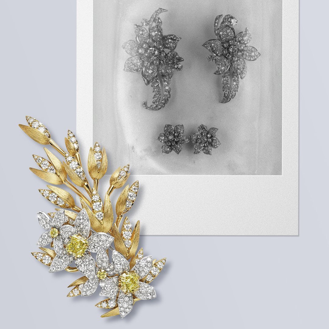 - Ring: Light as an oat stalk, curling around the finger, adorned with three blooming field stars encircling a 3.54ct pillow-cut yellow diamond, graded Fancy Intense Yellow, VVS2 clarity.