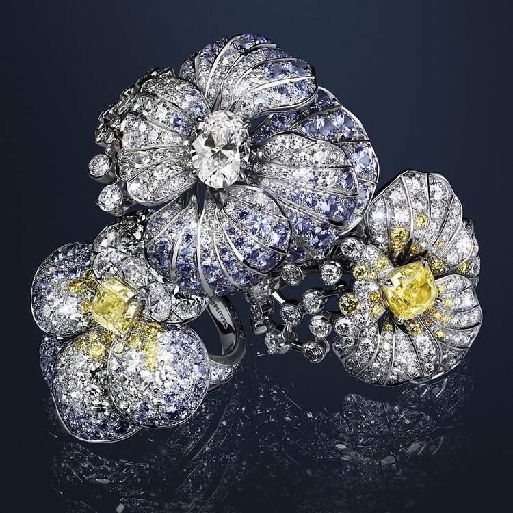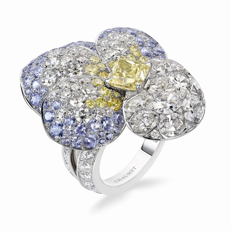 Chaumet introduces this “Pansy” themed diamond ring in its 2023 high jewelry collection, “Le Jardin de CHAUMET”. The designer skillfully crafts three rounded gemstone petals with a gradient color effect, setting a central diamond as the pistil, where the interplay of fire from different colored gems creates a vibrant sense of life.