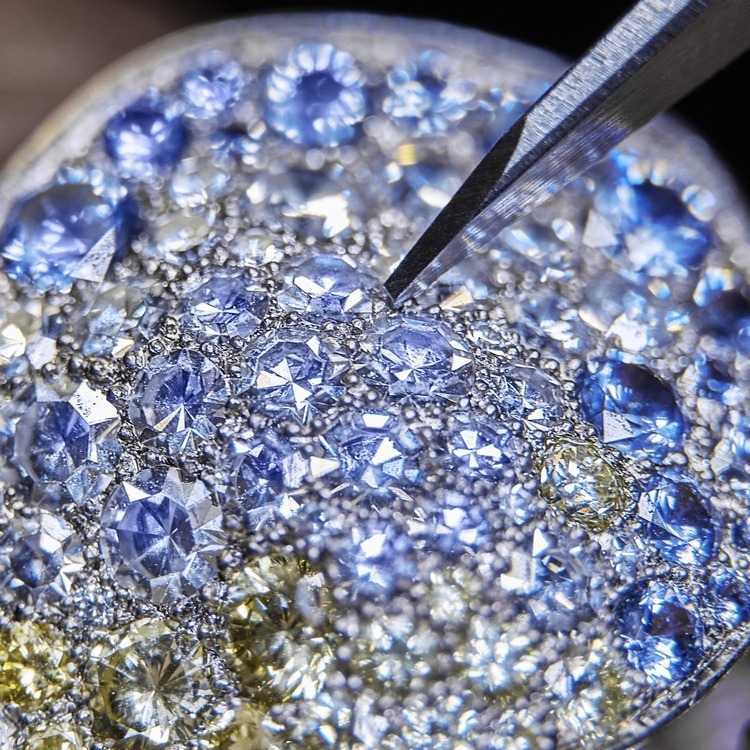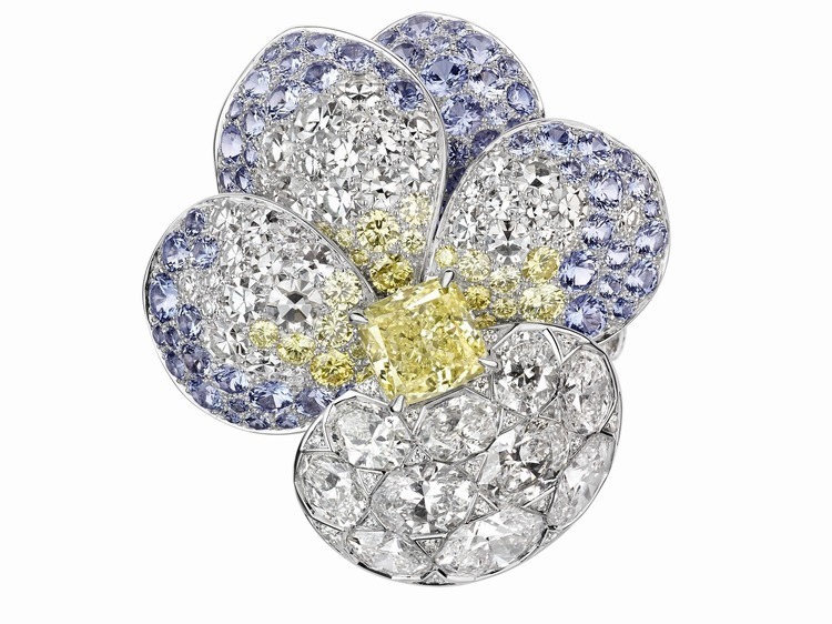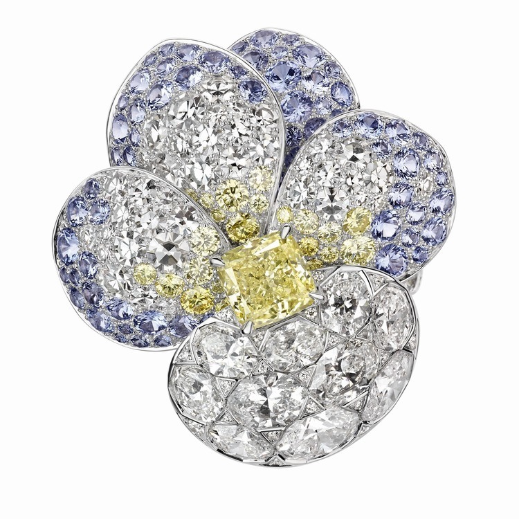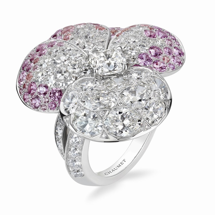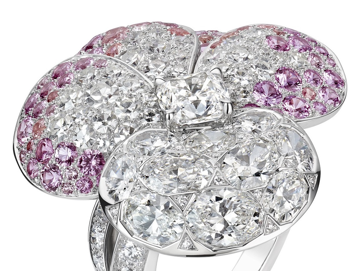 The new piece reinterprets the unique form of the pansy flower with a modern perspective – platinum shapes the plump, rounded petal outlines. One petal is set with a large oval diamond to showcase radiant brilliance; the other three petals are backed with snow-set diamonds, with their edges naturally transitioning to sapphires or pink sapphires, depicting the pansy’s naturally gradient color layers.