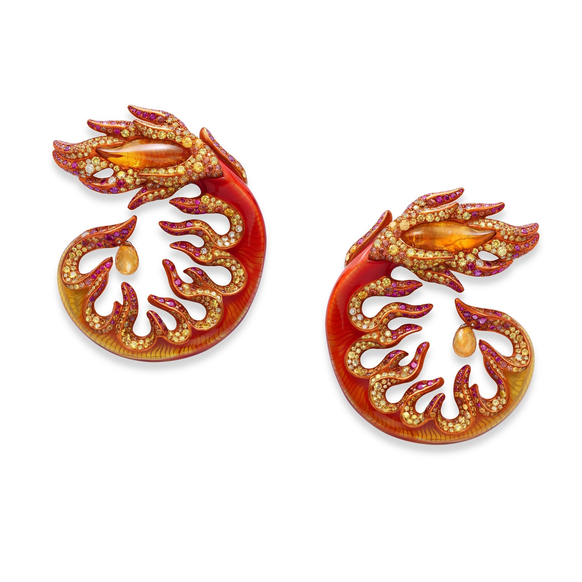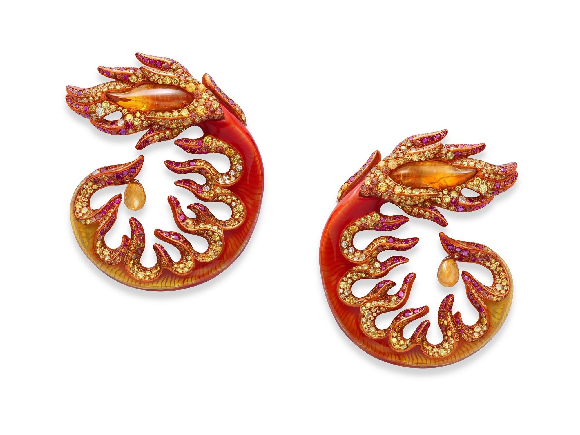 Part of Chopard’s 2021 Red Carpet High Jewelry Collection “Paradise”, the Fire set—comprising a ring and earrings—captures the vivid motion of a blazing flame. The designer skillfully combines custom-cut fire opals with yellow diamonds, rubies, and orange sapphires, using subtle variations in hue and texture to create the illusion of layered, flickering fire.