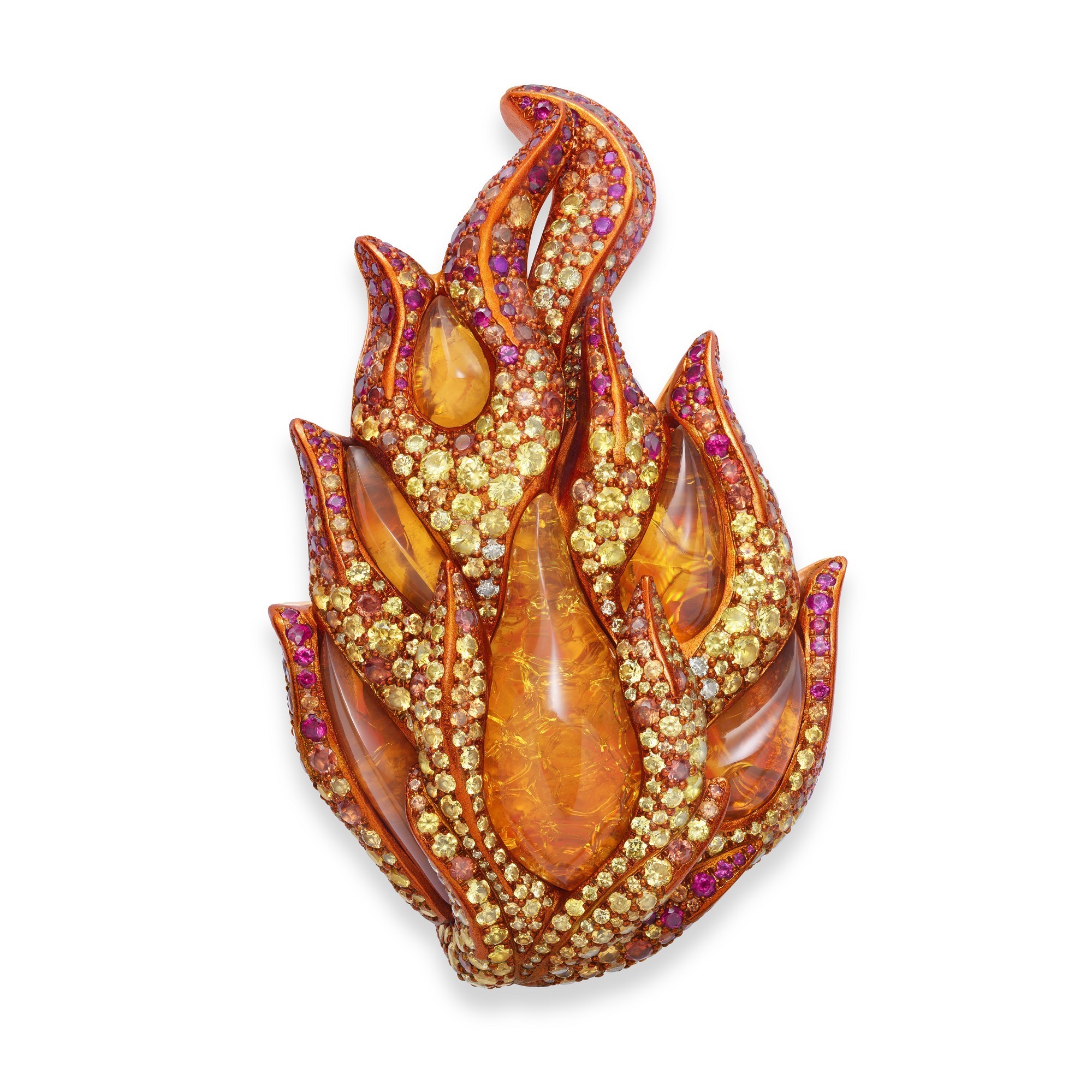 The Fire ring is composed of six overlapping flame motifs, each individually designed for unique curvature and proportion. At its heart burns a pear-shaped fire opal, colored by trace amounts of iron (Fe) to produce a bright, saturated orange hue. Surrounding the opal are clusters of yellow diamonds, rubies, and orange and yellow sapphires, contrasting beautifully with the gem’s translucent glow.