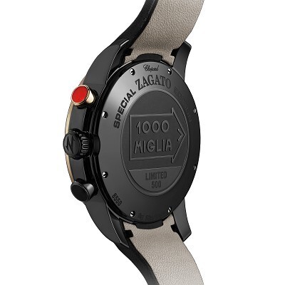The design style heavily incorporates elements from Zagato sports cars and the Mille Miglia race, such as a high-tech DLC scratch-resistant case, Z-shaped dial decoration, the “100 Miglia” logo on the back, and striking red leather stitching.