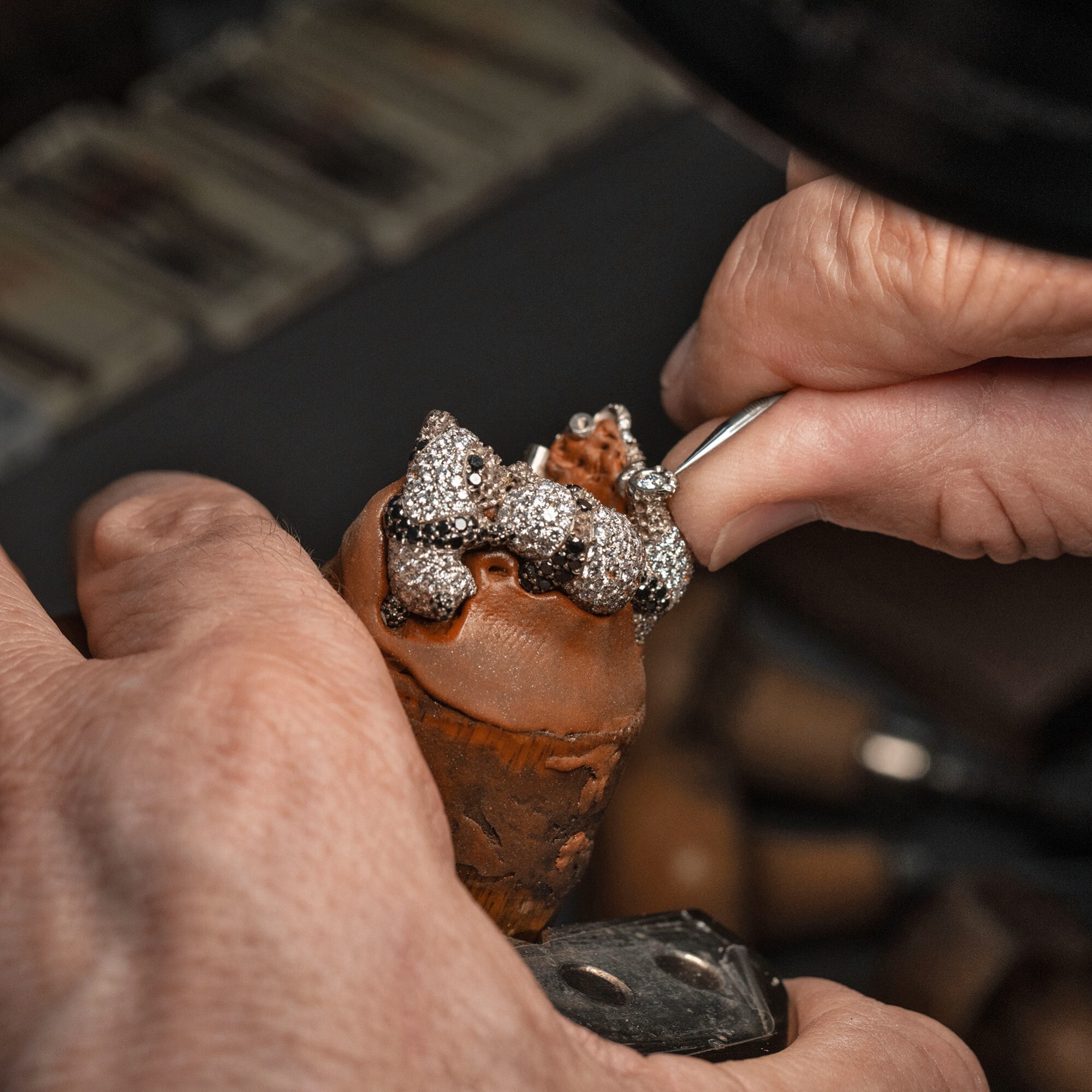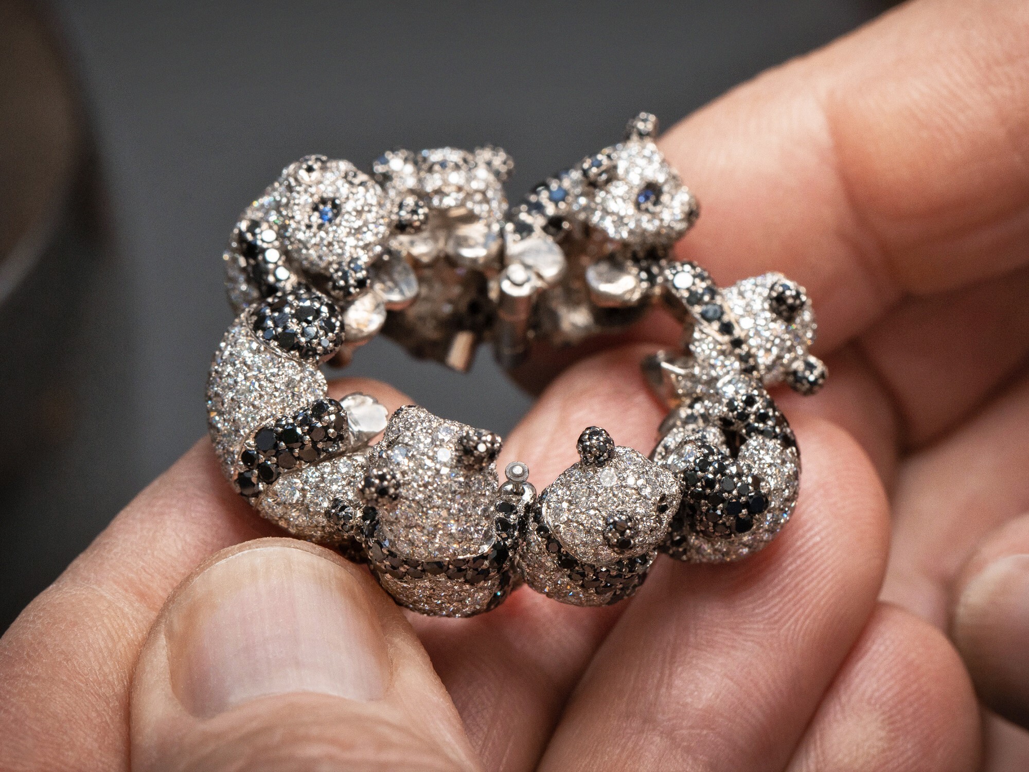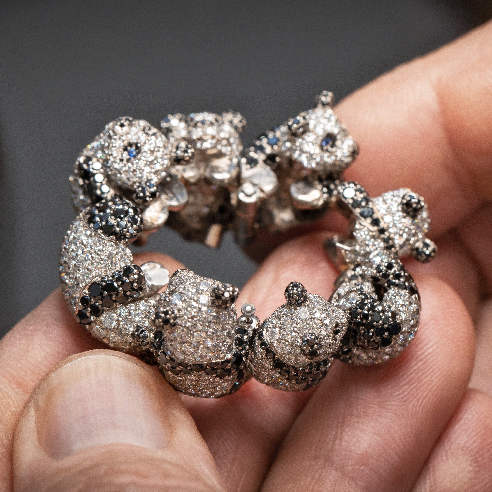 The design employs white and black diamonds to sculpt the panda’s adorable forms. The heads and bodies are crafted in platinum, set with brilliant white diamonds for a soft, rounded effect. The limbs, ears, heart-shaped nose, and signature black eye patches are rendered in black diamonds, while the round-cut sapphires serve as sparkling eyes, giving the pandas a lively and endearing expression.
