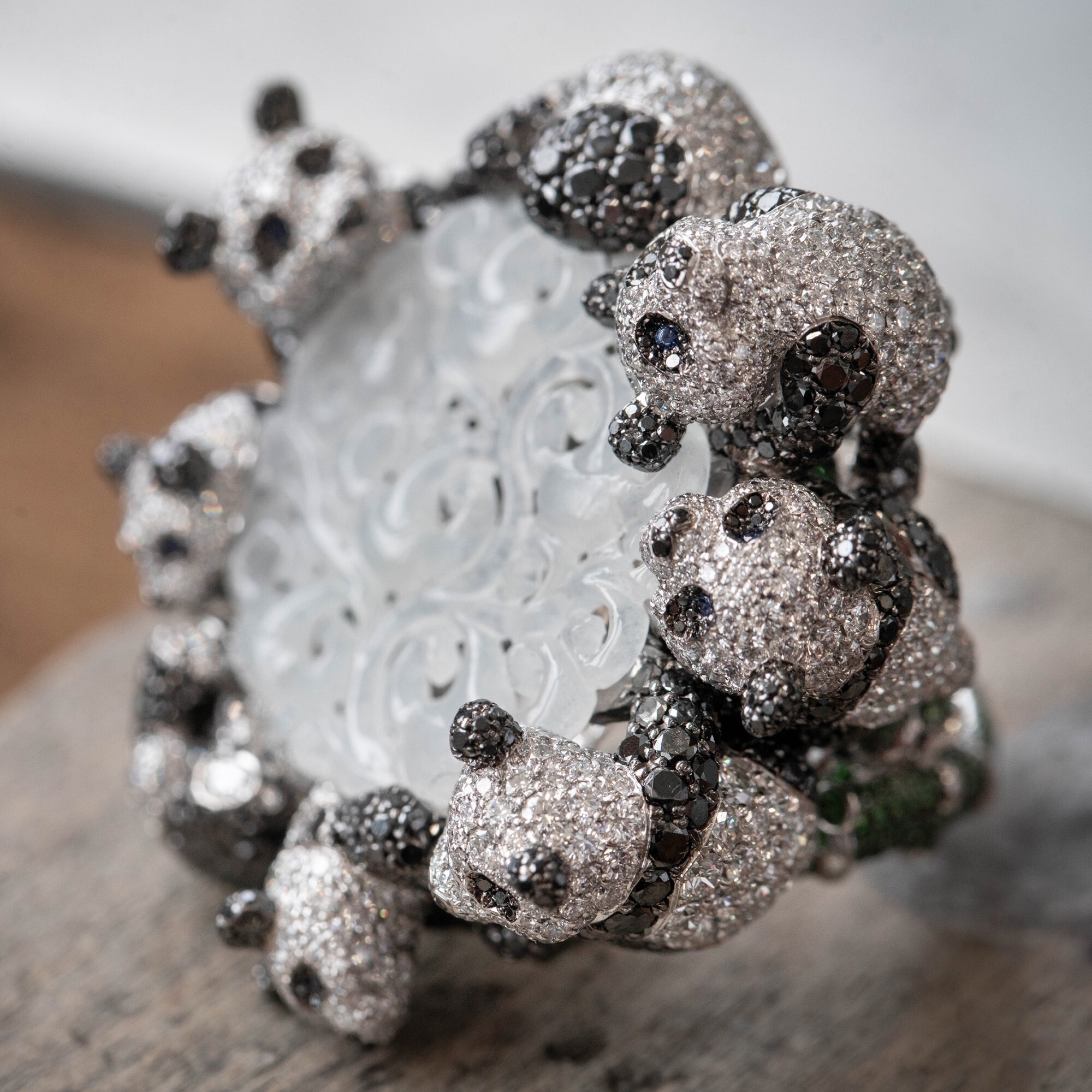 The central jadeite cabochon is of premium quality with delicate floral patterns. Surrounding the stone are eight playful panda cubs, some peeking around, others exploring behind the jade, capturing whimsical, heartwarming movements. The platinum ring shank is pavé-set with tsavorite garnets, evoking lush bamboo leaves, enhancing the ring’s oriental charm and poetic elegance.