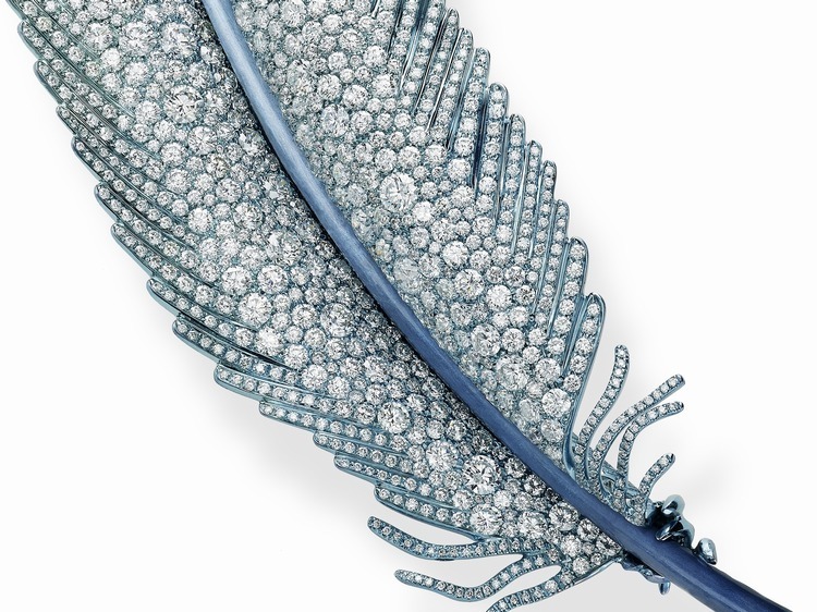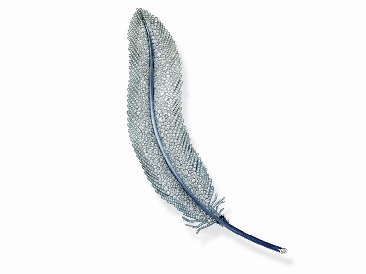 Chopard introduced this brooch in its 2023 Red Carpet High Jewelry collection. Inspired by the season’s theme of “Literary Arts”, Creative Director Caroline Scheufele masterfully drew upon the medieval quill pen as her design element. Using titanium to outline the elegant contour of the feather, she set a diamond at the tip of the shaft, resembling the pen nib dipped in ink ready for writing.