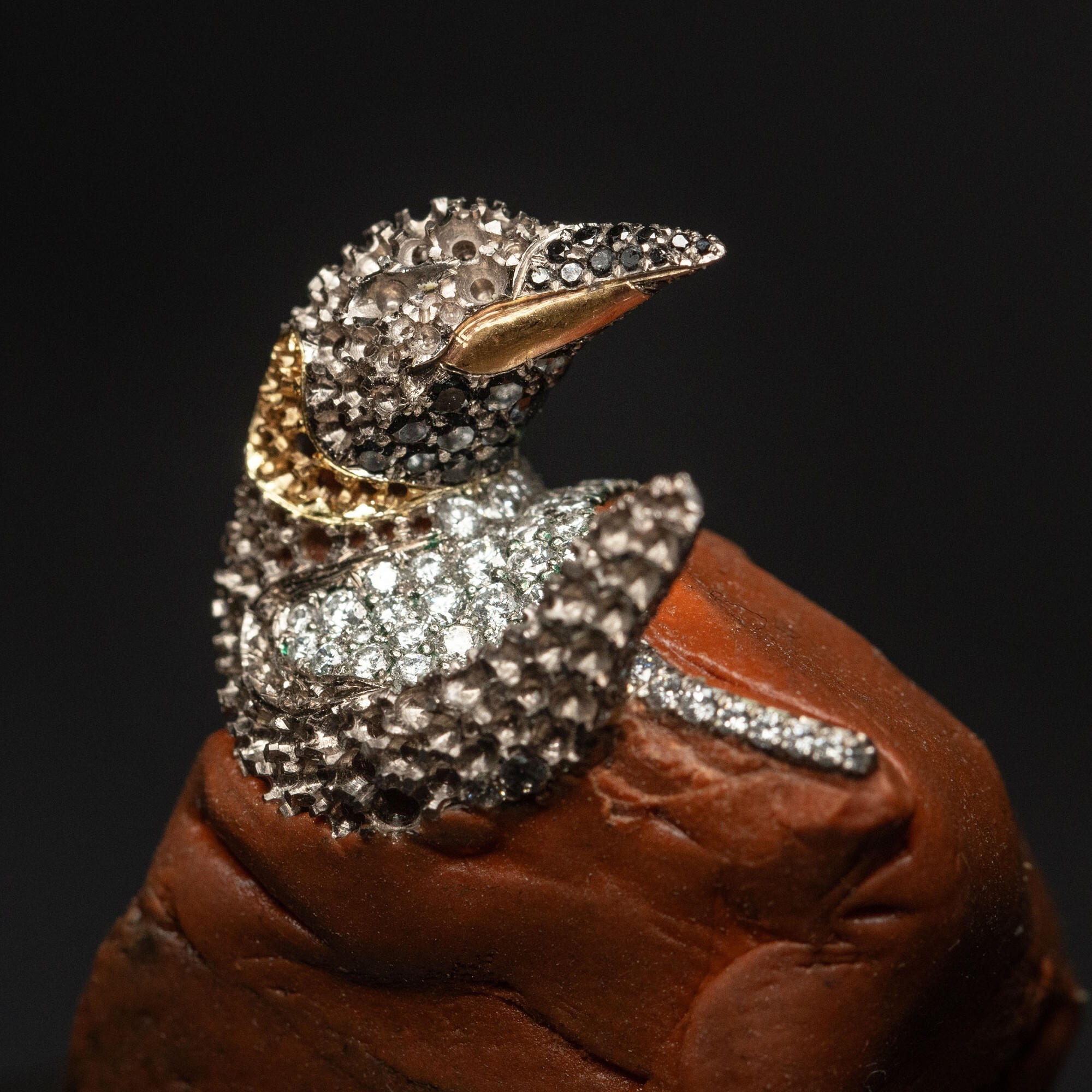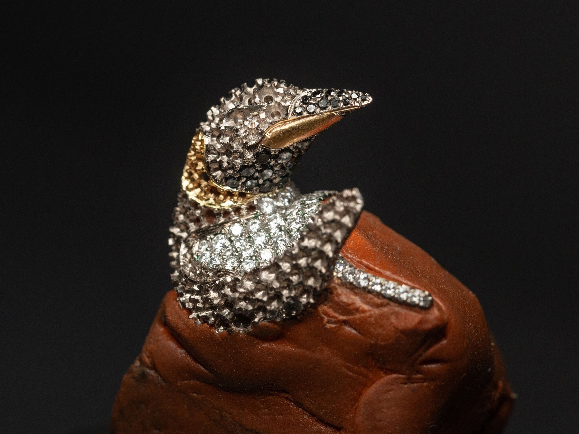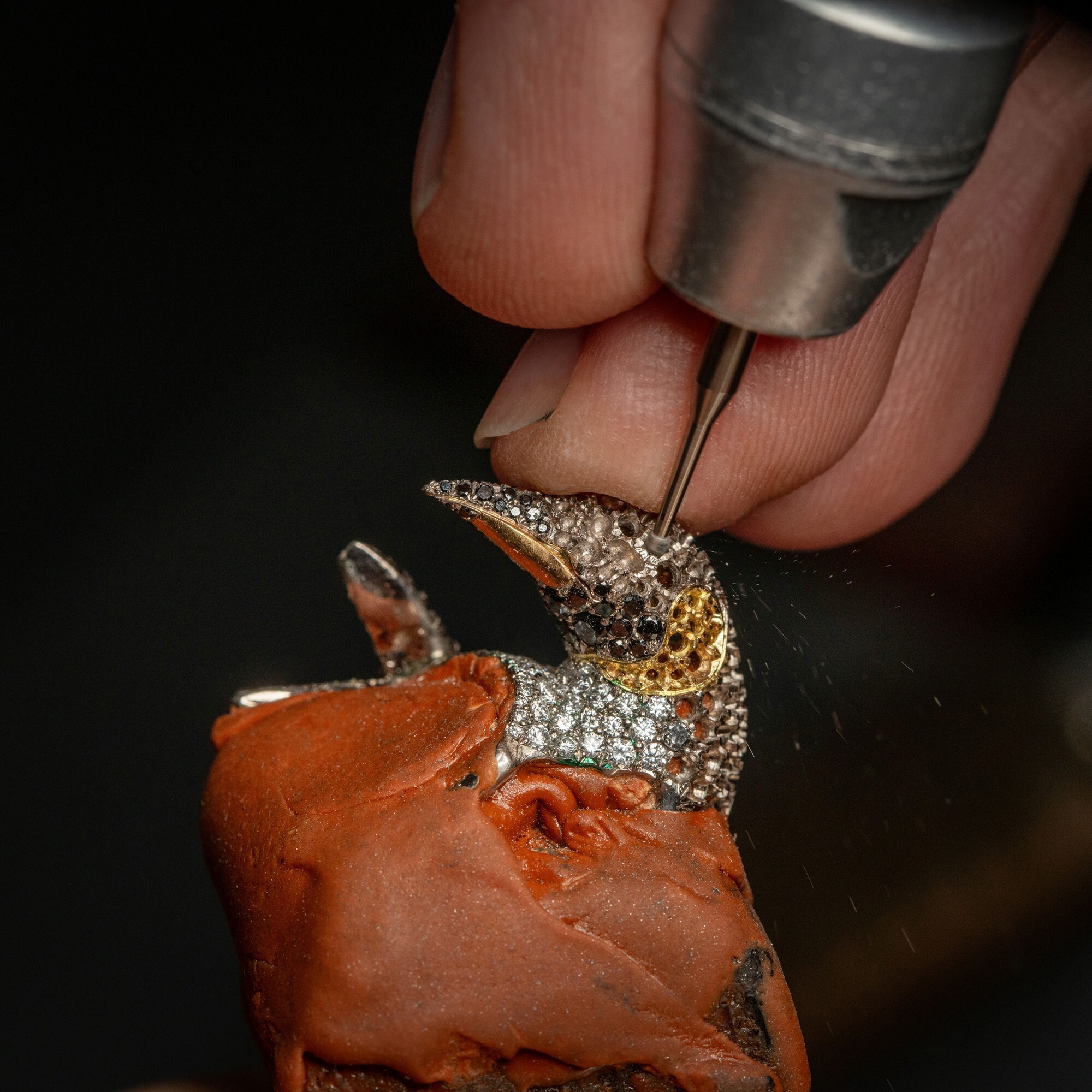 The designer vividly brings a family of Emperor penguins to life through metallurgy and diamond setting. Two adult emperor penguins are adorned in contrasting black and white diamond “evening wear”. Their golden lower beaks, polished to a mirror finish, catch the light and harmonize with the spessartite garnet-paved orange-yellow neck feathers, creating a dazzling accent. Three emperor penguin chicks are almost entirely covered in snow-white diamond plumage, with only their heads featuring helmet-like black diamond feathers. Their rounded faces accentuate the onyx eyes, and their amusingly charming expressions are sure to bring a smile.