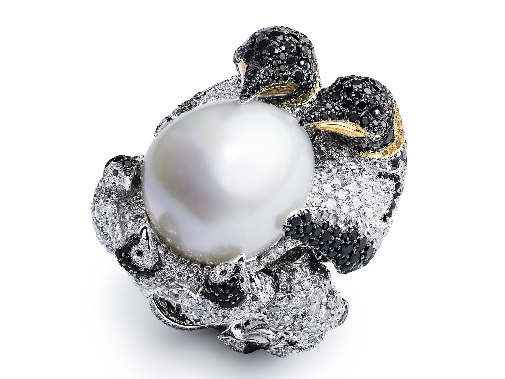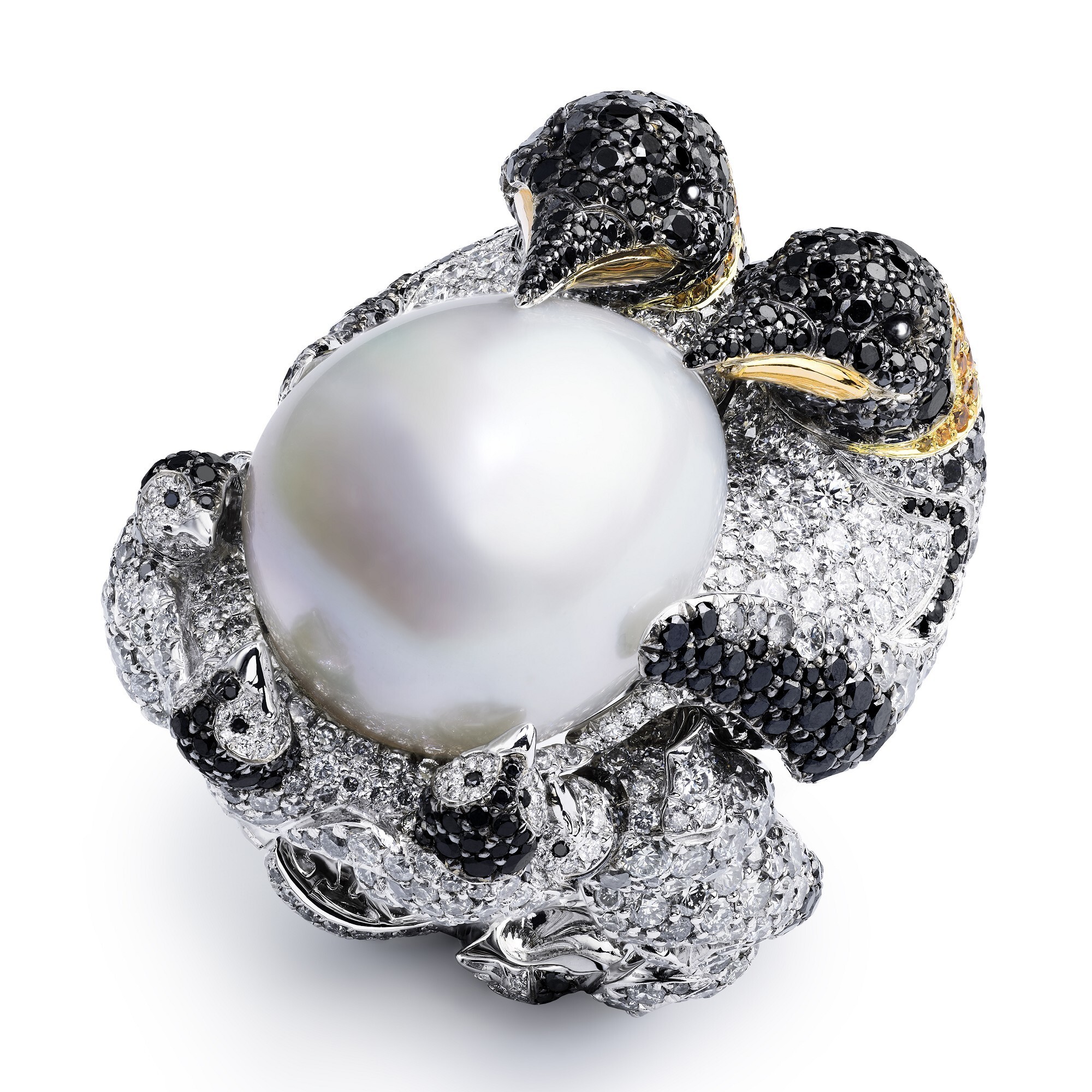 The most captivating feature is undoubtedly the 30.91-carat South Sea white pearl prominently set at the center of the ring. Like a treasure carefully guarded by the penguin family, its lustrous glow intertwines with the sparkle of the diamonds, paying homage to the vitality and poetry of the polar world. The white gold ring mount is set with black and white diamonds, continuing the color scheme of the ring’s face.