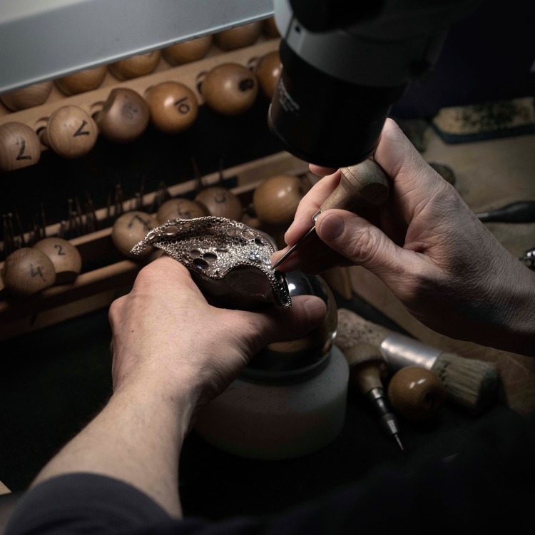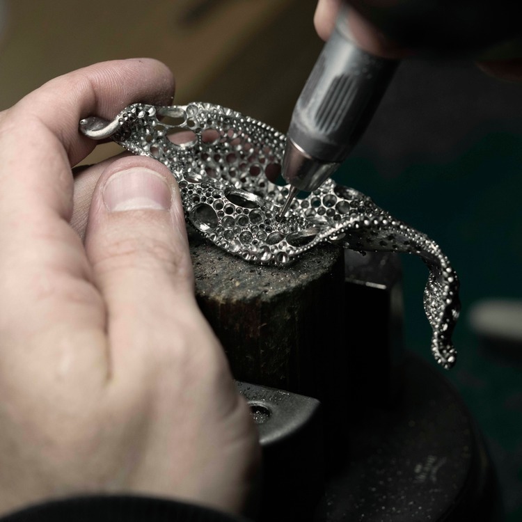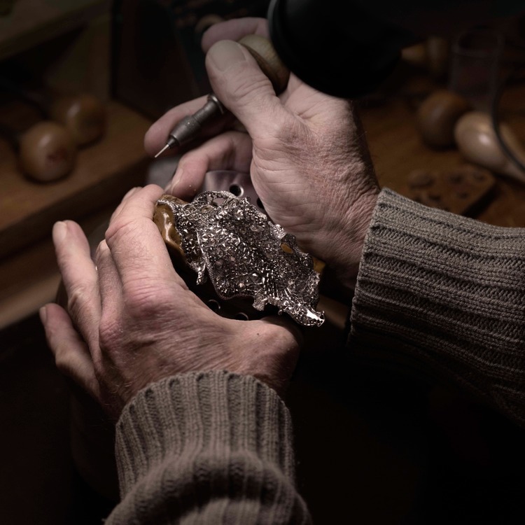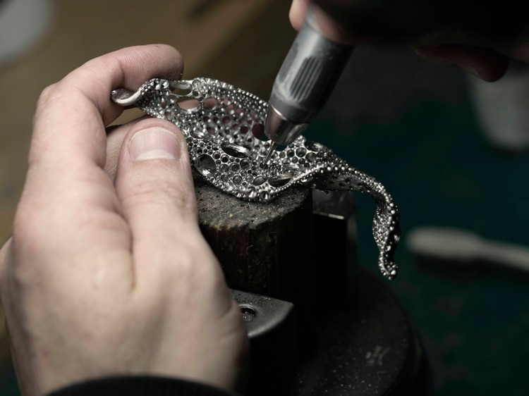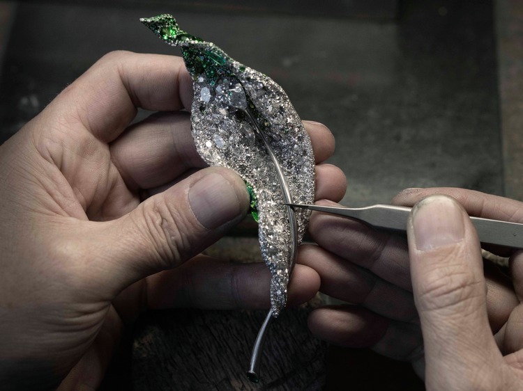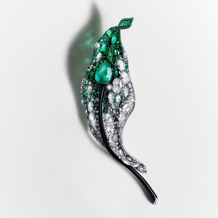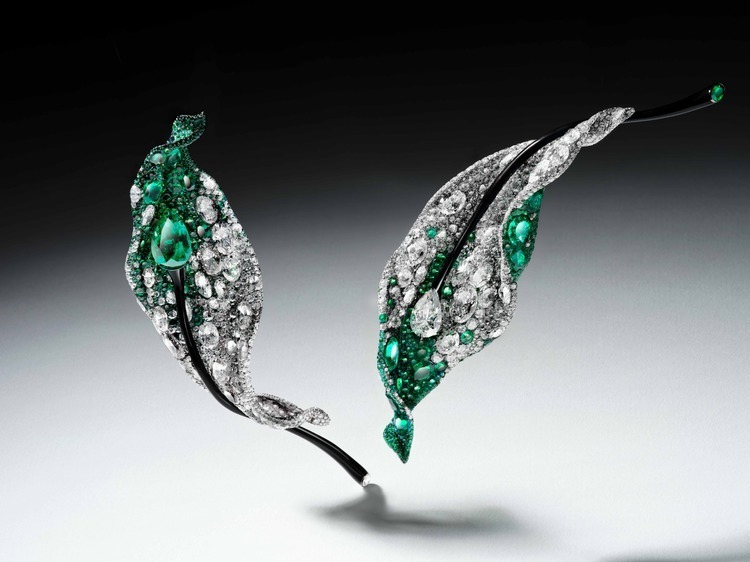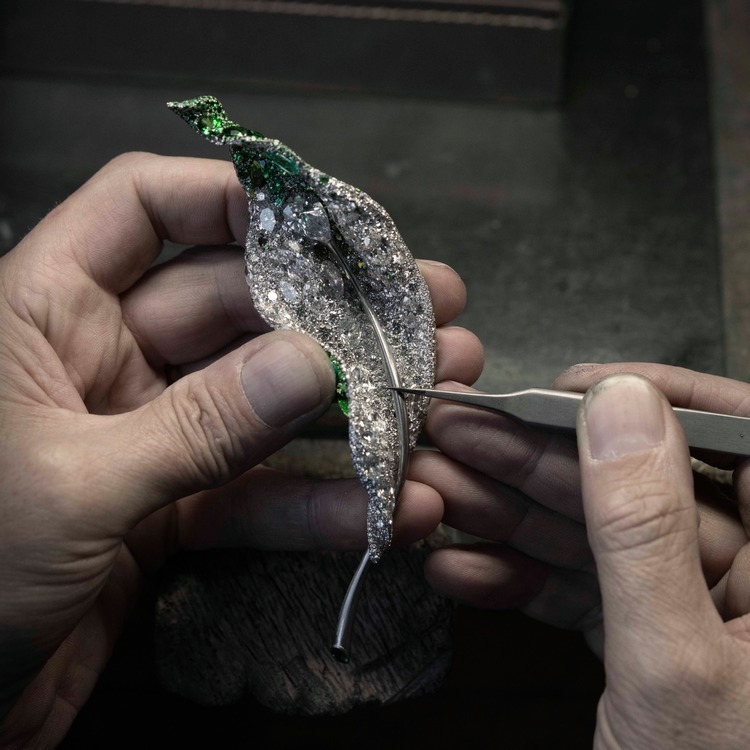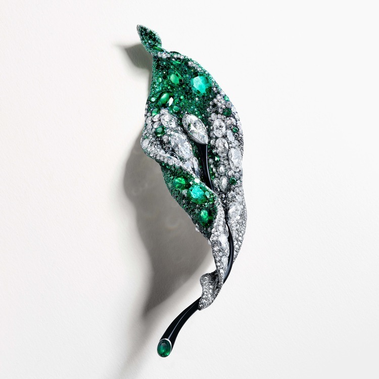 The new creations continue the brand’s signature titanium craftsmanship, developed in collaboration with 12 European master artisans and reworked over 10 times. The artisans had to create large, curved folds fully set with gemstones on titanium metal a mere 1.77mm thick. Each brooch is set with an average of over 1500 gemstones, yet weighs only 22 grams, achieving the agile lightness of a real leaf.