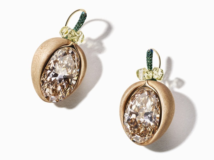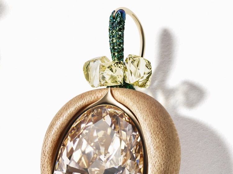 The most striking feature of this new work is the introduction of non-traditional materials. The artist creatively carved natural maple wood into cupule shapes and embedded two oval-cut coffee-colored diamonds with a total weight of 50 carats. The bright, light brown fire of these diamonds resembles fresh kernels, creating an evocative natural aesthetic.
