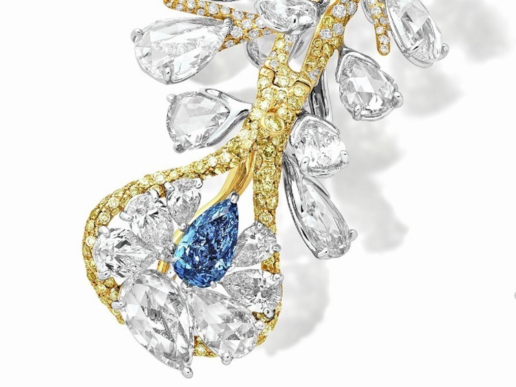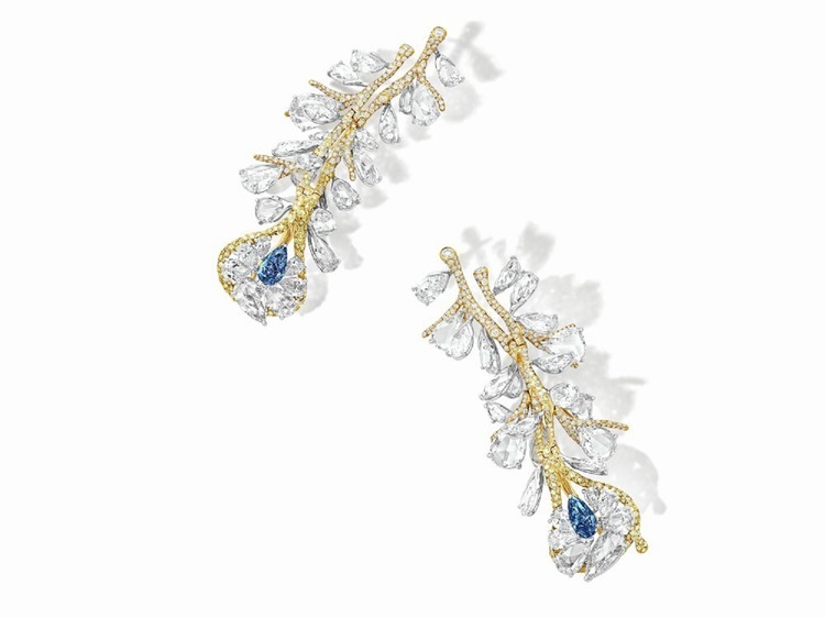 Cindy Chao specially selected two pear-shaped blue diamonds with extremely similar weight, cut, and color grade, weighing 0.70 carats and 0.86 carats respectively. Both diamonds achieve the Fancy Intense Blue color grade – blue diamonds account for only about 0.5% of total colored diamond production, and matched pairs of blue diamonds are even rarer, making them truly exceptional treasures of nature.