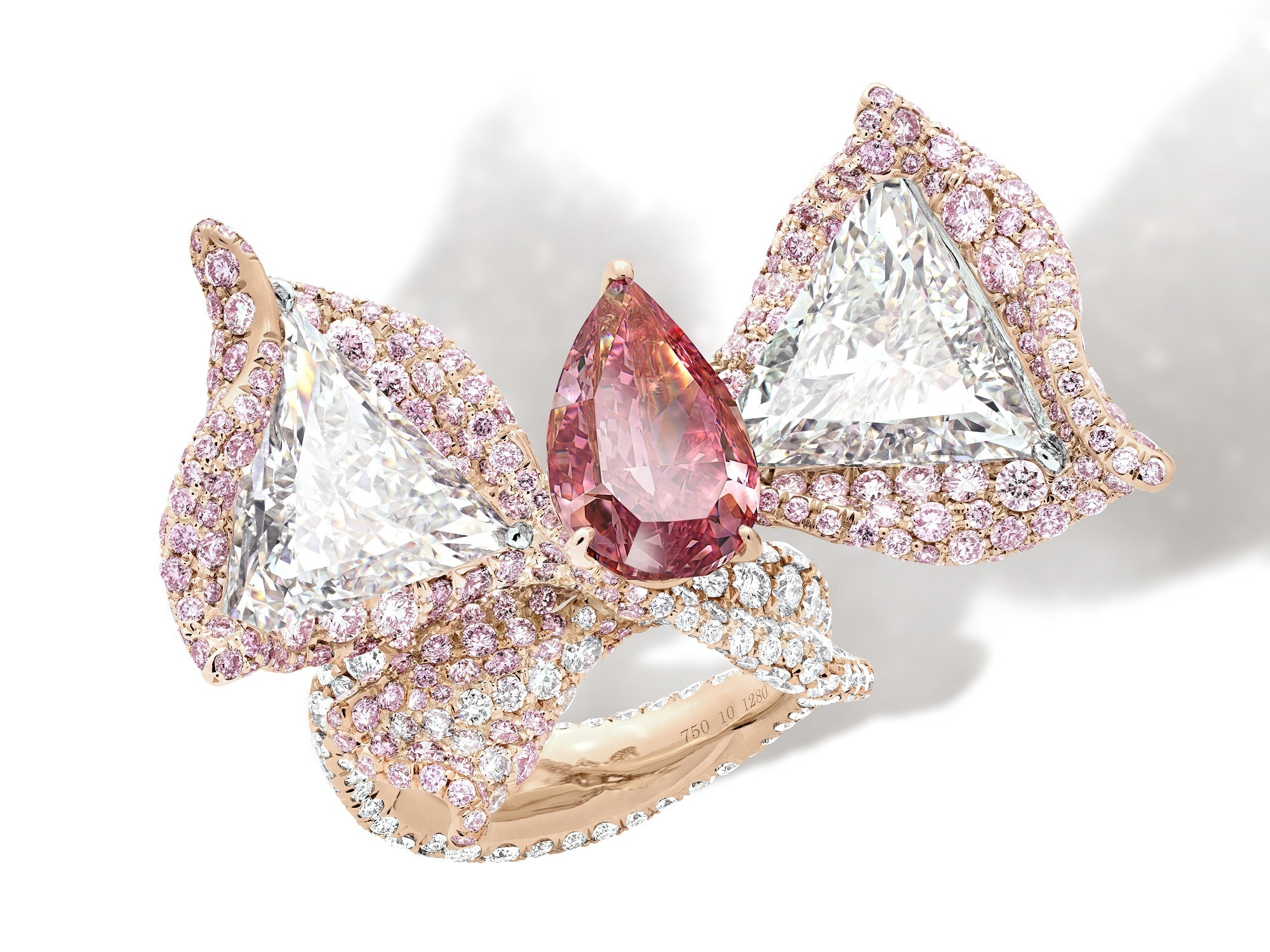The rose gold ring shank is crafted to resemble naturally flowing ribbons that seamlessly connect with the bow design. The surface of the ribbons features three-dimensional pleated details, paved with an artful arrangement of pink and colorless diamonds that echo the pear-shaped pink diamond centerpiece, presenting a soft and elegant style.