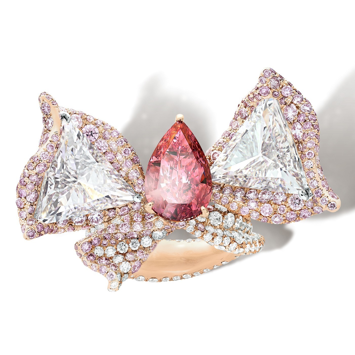 The centerpiece is a 3.31-carat pear-cut pink diamond, a rare gem of the highest Fancy Vivid Pink color grade, exhibiting a rich and clear pink hue. This pink diamond is accented by two triangle-cut diamonds and pavé-set with round-cut pink and colorless diamonds.