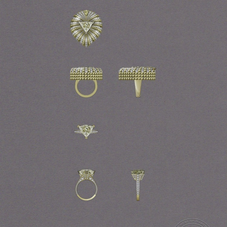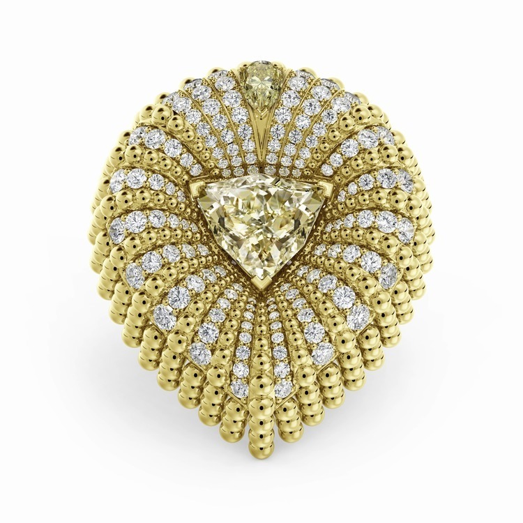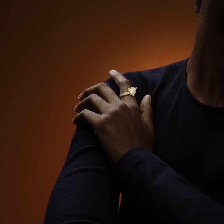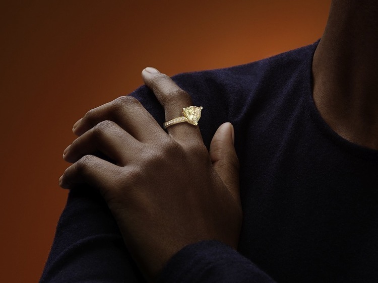 The solitaire ring features a 5.09-carat triangular-cut diamond. This diamond is certified with a color grade of Y to Z and VS1 clarity, exhibiting a delicate light yellow tone. Its distinctive triangular cut elegantly suggests the contour of a lion’s face.