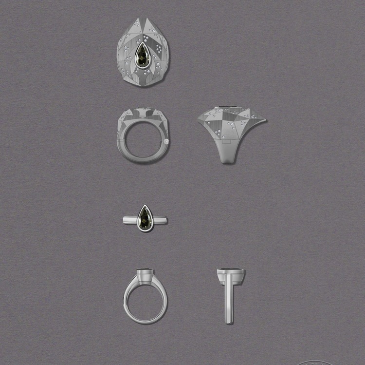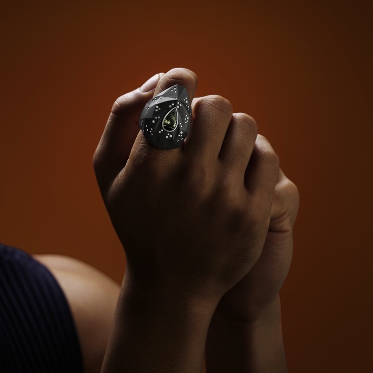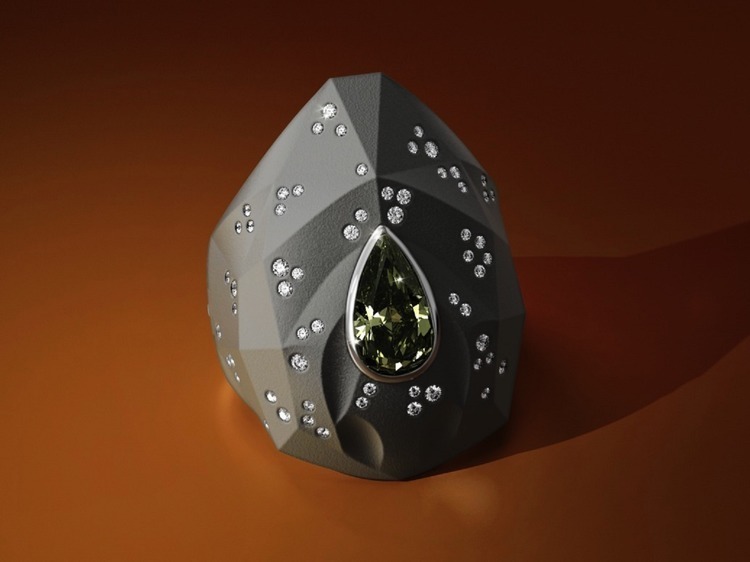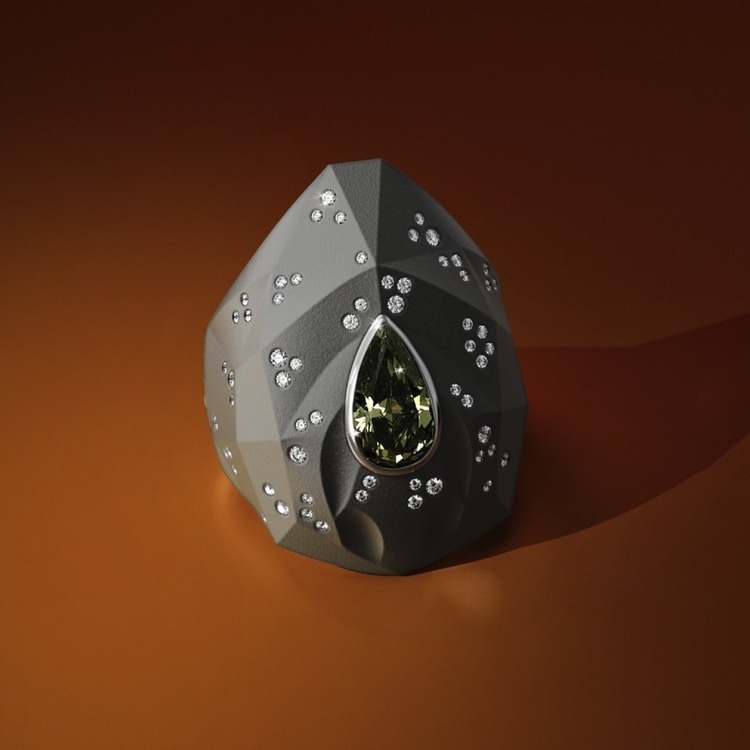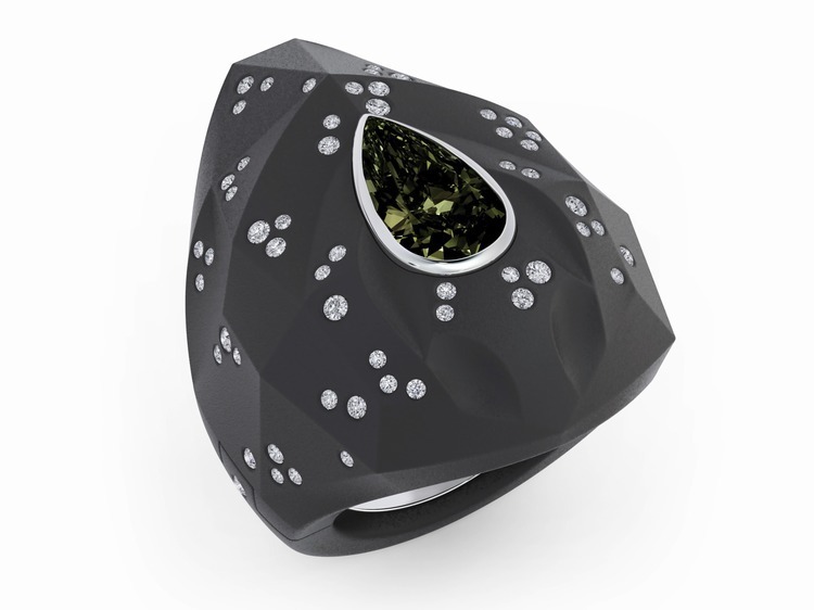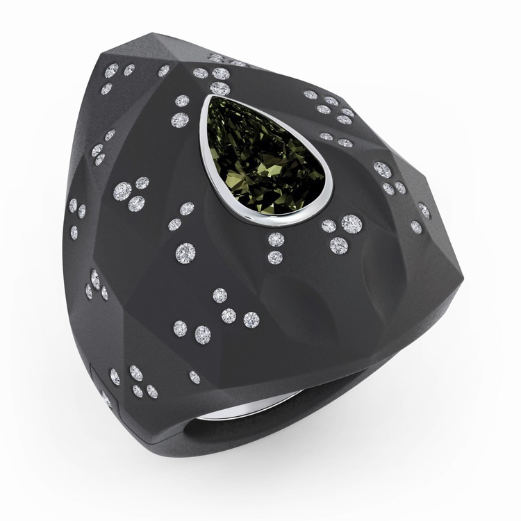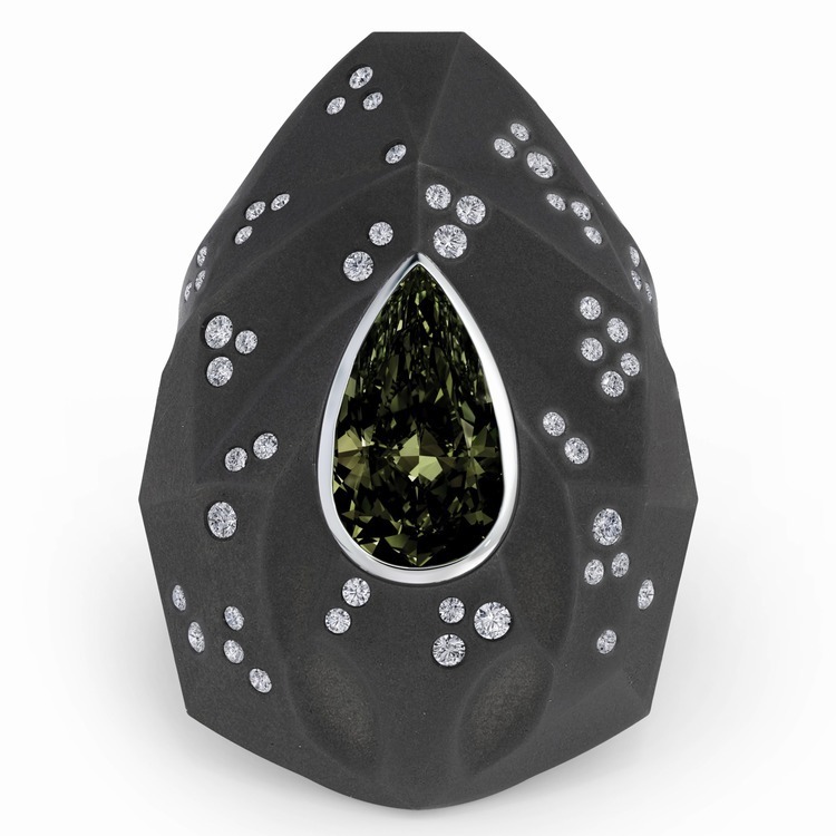 The solitaire ring is crafted from titanium and features a bezel-set 3.17-carat pear-cut greenish yellow diamond as its centerpiece. The sharp shape of the primary stone is reminiscent of a rhinoceros’s horn.