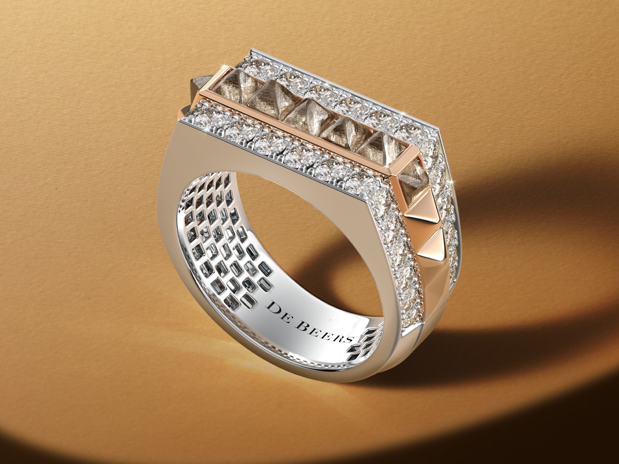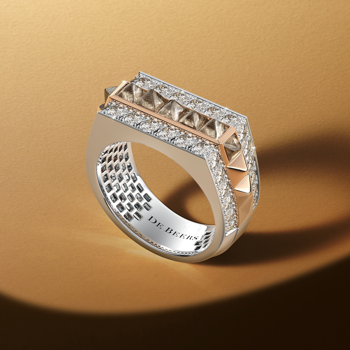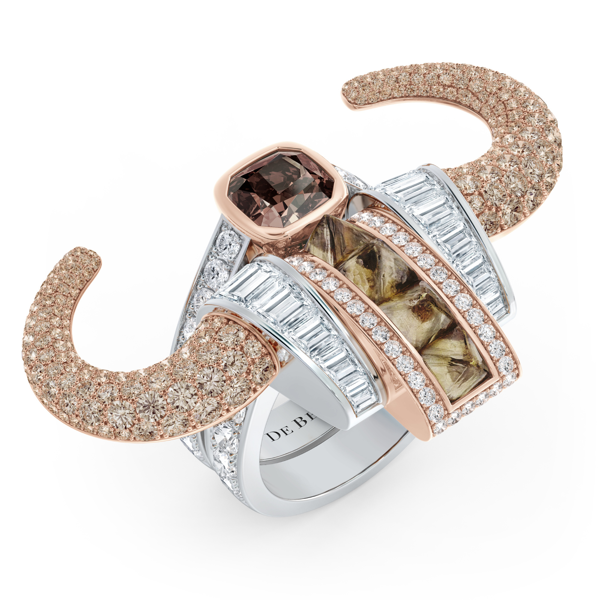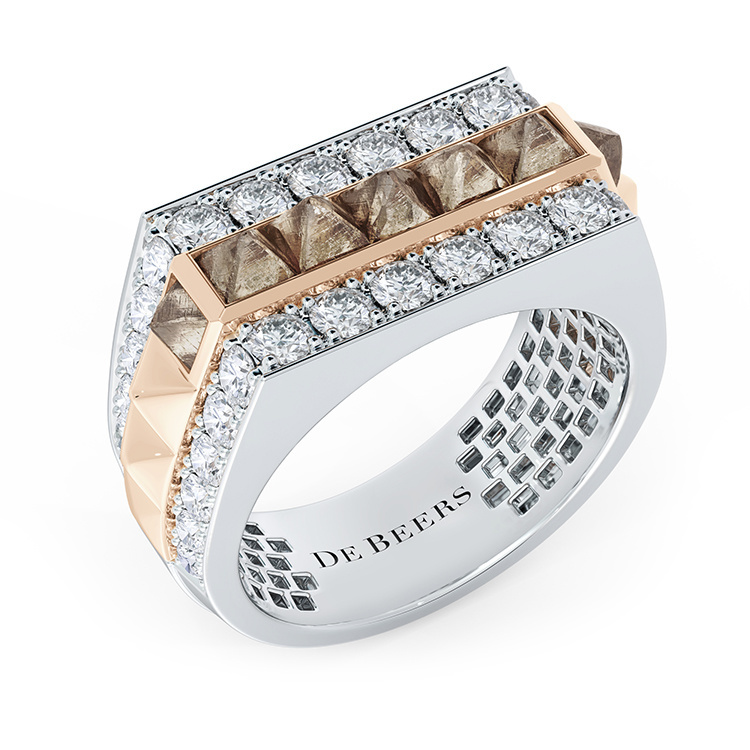 Another abstract-style ring features a linear, geometric band set with round brilliant-cut diamonds at both ends and a hexagonal brown rough diamond at the center, reminiscent of the buffalo’s pointed horns.