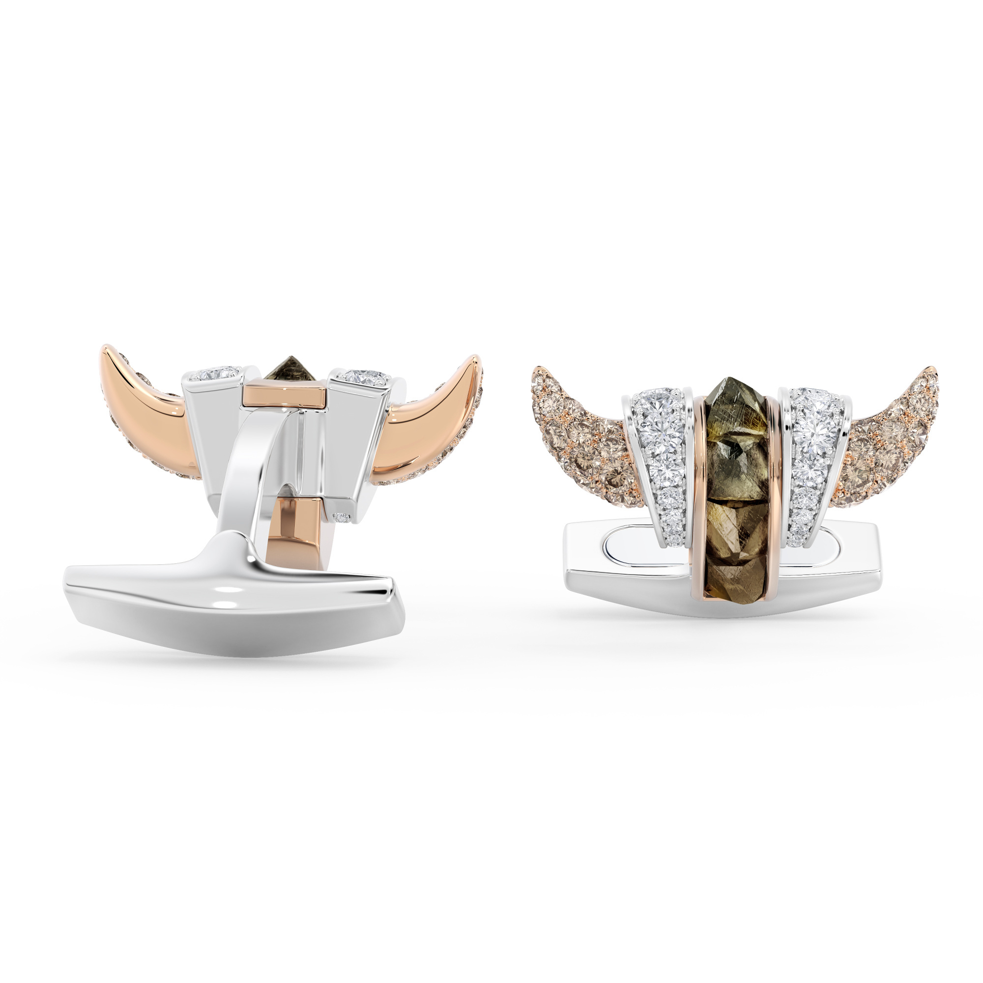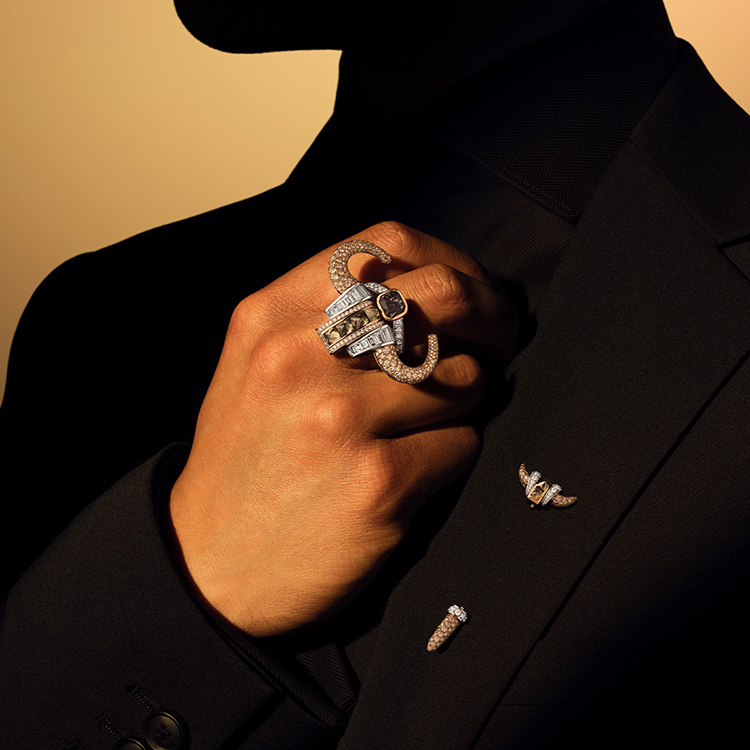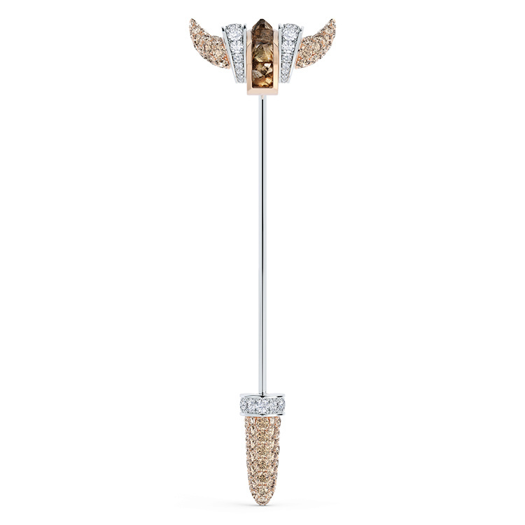 The cufflinks vividly portray the head of the buffalo, with unpolished fancy rough diamonds exuding a primal and natural spirit. The lapel pin is completed with a bullet-shaped cap and pavé-set with round brilliant-cut colorless and brown diamonds.