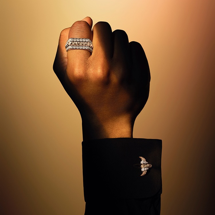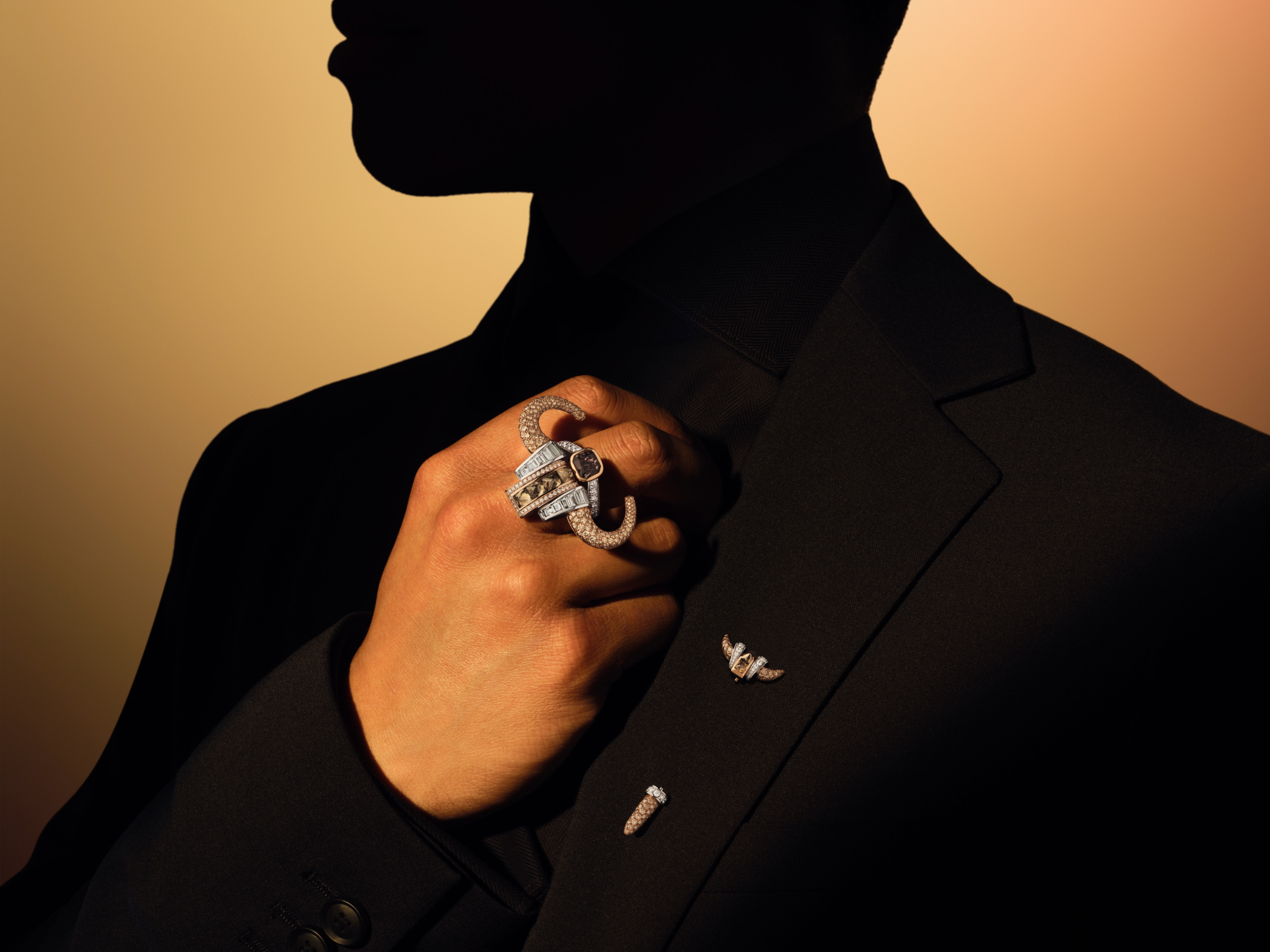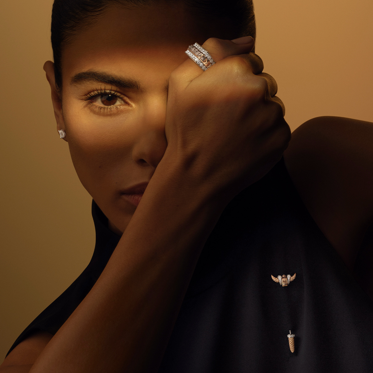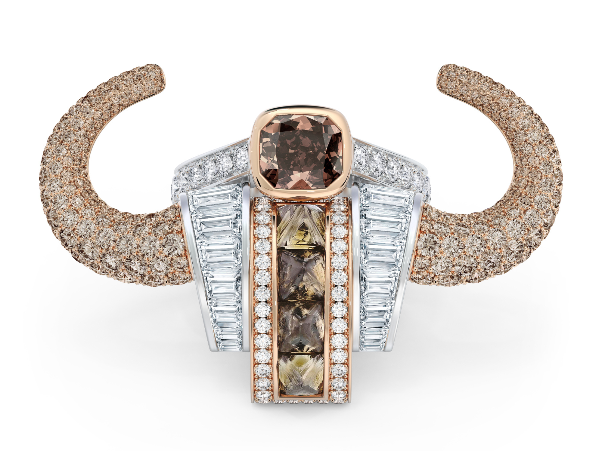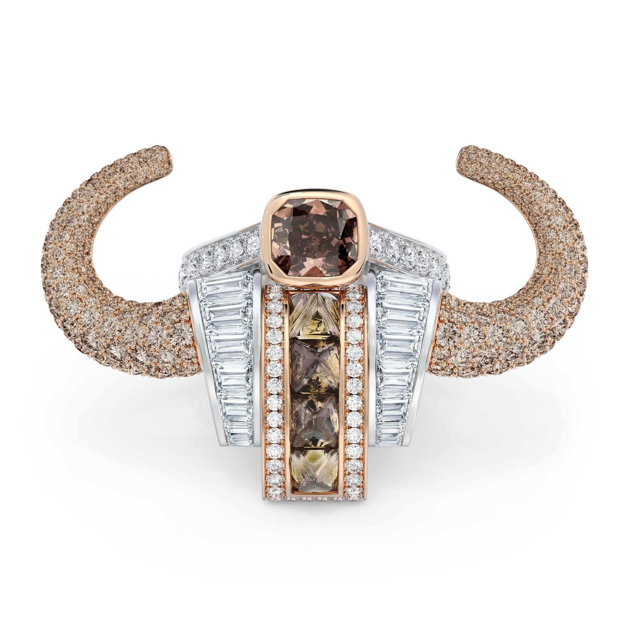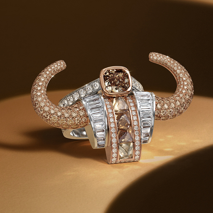 The set comprises four pieces, the most ingenious of which is the transformable Stability Crown Ring. The “main ring” depicts the buffalo’s head, topped with a 2.01-carat radiant-cut orange-brown diamond and accented by four rough brown diamonds forming the face. The “decorative ring,” pavé-set with brown diamonds, evokes the powerful horns. The two rings can be worn separately or combined, offering versatile styling possibilities.