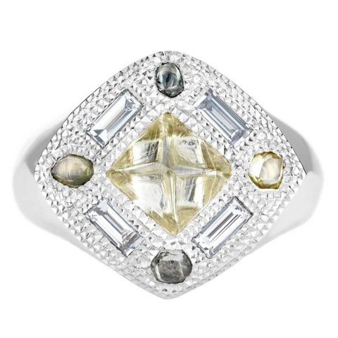 Another abstract-style ring features a linear, geometric band set with round brilliant-cut diamonds at both ends and a hexagonal brown rough diamond at the center, reminiscent of the buffalo’s pointed horns.