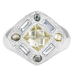 This ring is part of De Beers’ Talisman collection, created to commemorate the 10th anniversary of their rough diamond series. In ancient Egypt, natural rough diamonds were believed to possess supernatural powers and were used as protective amulets. Inspired by these ancient legends, De Beers preserved the natural octahedral shape of the diamond, creating a collection that embodies the symbolism of protection.