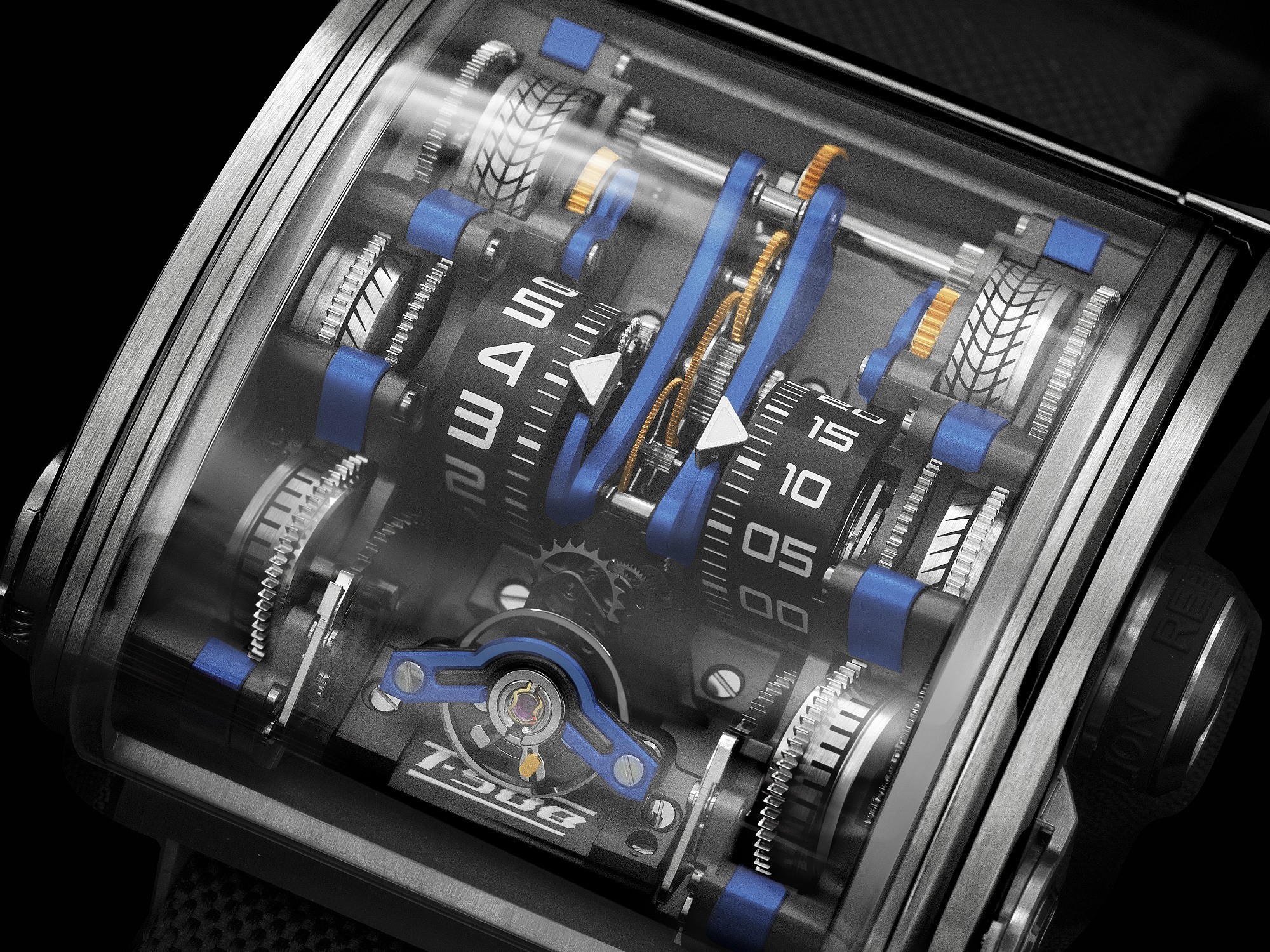 Beneath the domed sapphire crystal, the intricate movement is fully visible. Two parallel rotating numeral discs display the time—hours on the left, minutes on the right—while a tilted balance wheel is positioned at 6 o’clock. On both sides of the dial, six vertically arranged barrels are symmetrically placed, each engraved with a tire tread motif in tribute to Rebellion’s deep ties with motorsport.