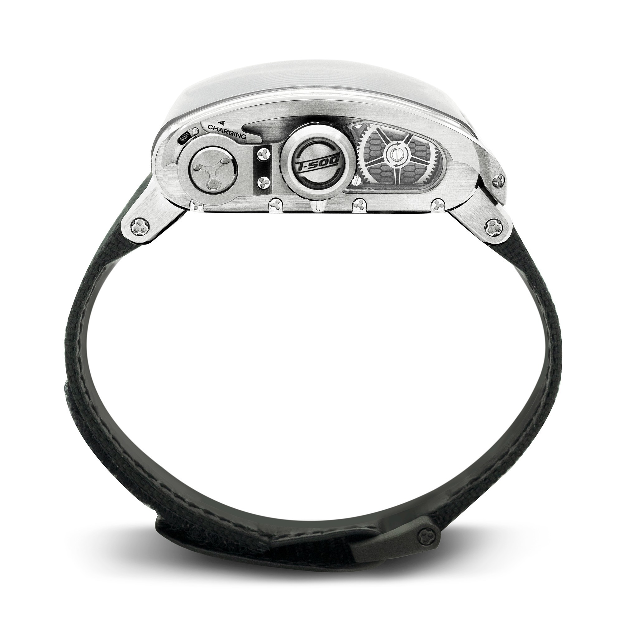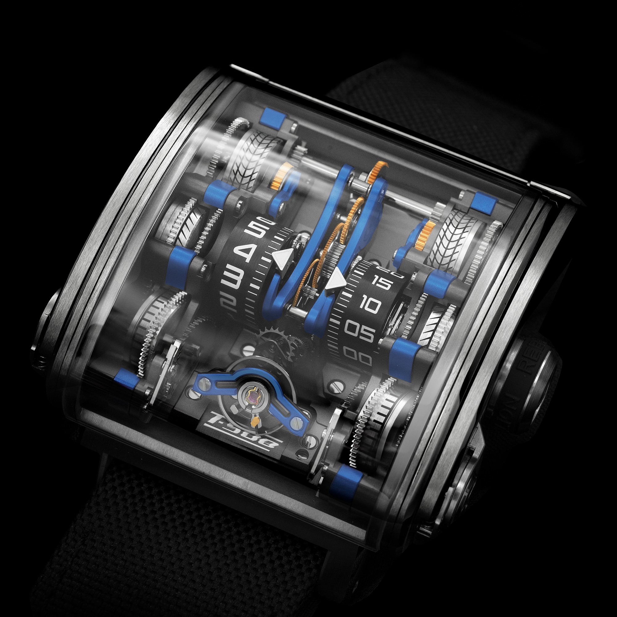 Titanium case, 43 mm × 47.5 mm, thickness 11 mm,Domed sapphire crystal,Manually wound movement, 39 jewels, 28,800 vph,Power reserve: 450 hours,Black fabric strap with titanium buckle,Water-resistant to 10 m,Limited edition of 10 pieces.