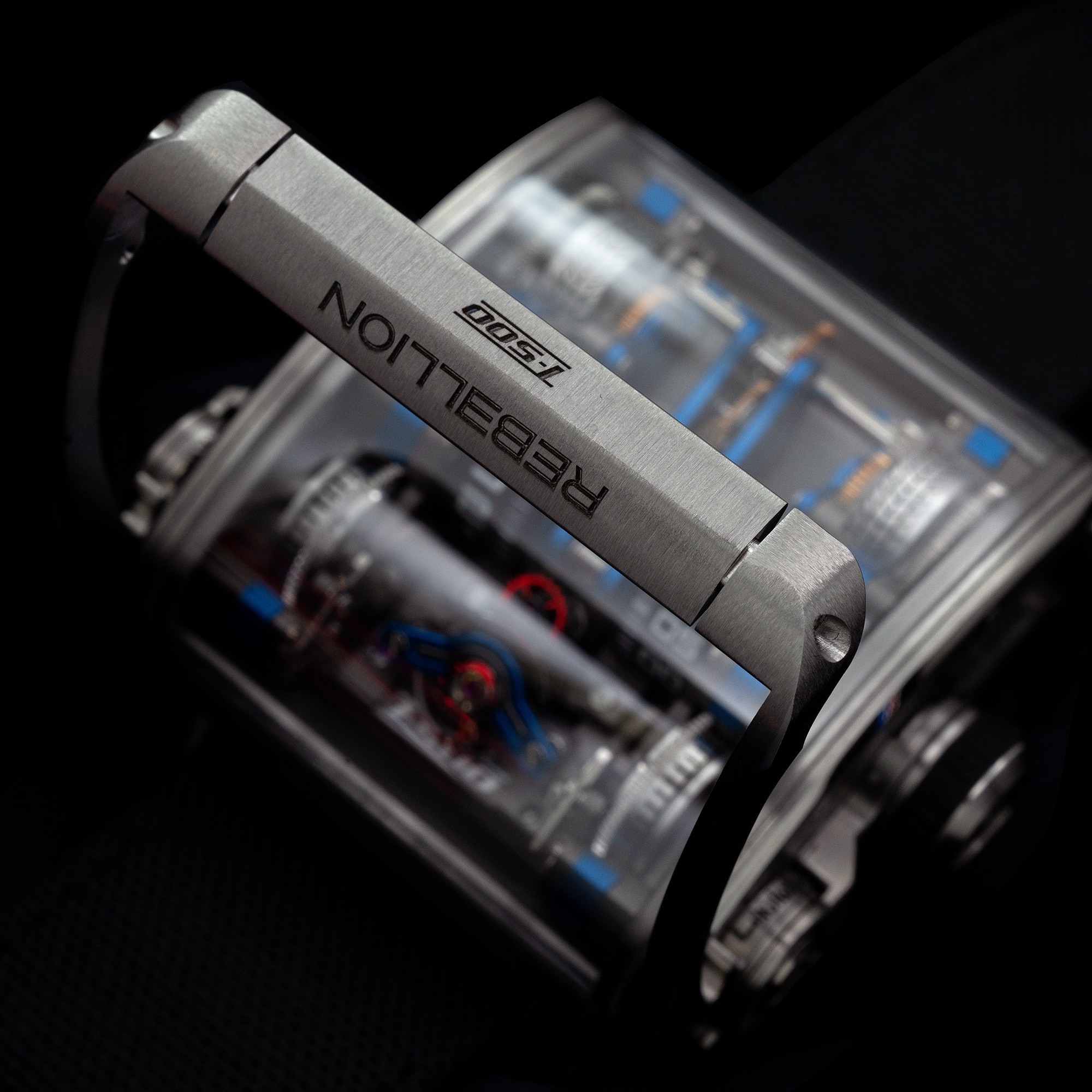 Beneath the domed sapphire crystal, the intricate movement is fully visible. Two parallel rotating numeral discs display the time—hours on the left, minutes on the right—while a tilted balance wheel is positioned at 6 o’clock. On both sides of the dial, six vertically arranged barrels are symmetrically placed, each engraved with a tire tread motif in tribute to Rebellion’s deep ties with motorsport.
