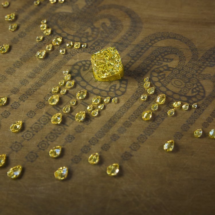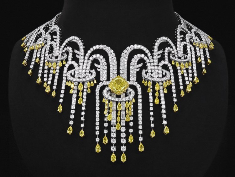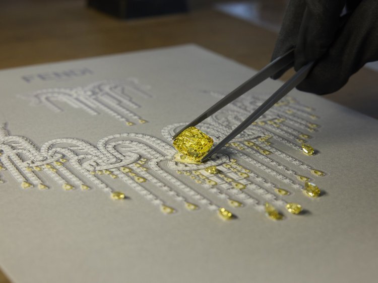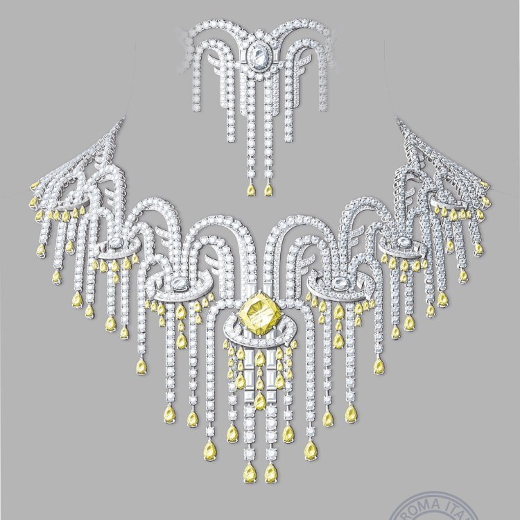 At its heart lies a 20.25-carat cushion-cut fancy vivid yellow diamond, the centerpiece of the composition—radiant, flawless, and ablaze with golden fire. Beneath it, the necklace culminates in a cascade of 100 graduated pear-shaped yellow diamonds, shimmering like sunlit droplets in motion, echoing the eternal brilliance of FENDI’s centennial celebration.