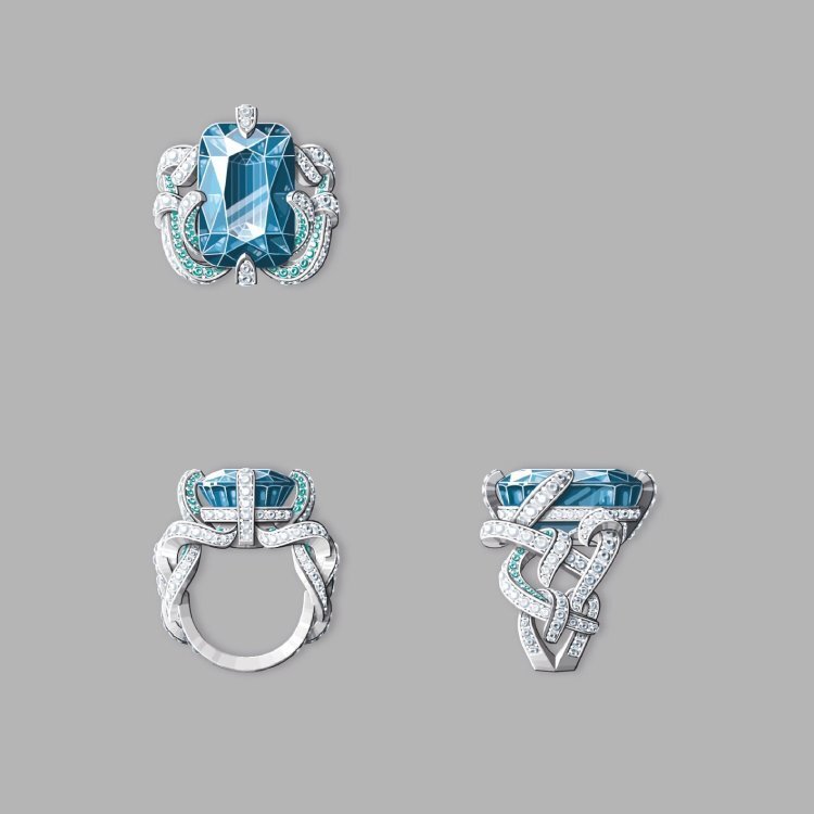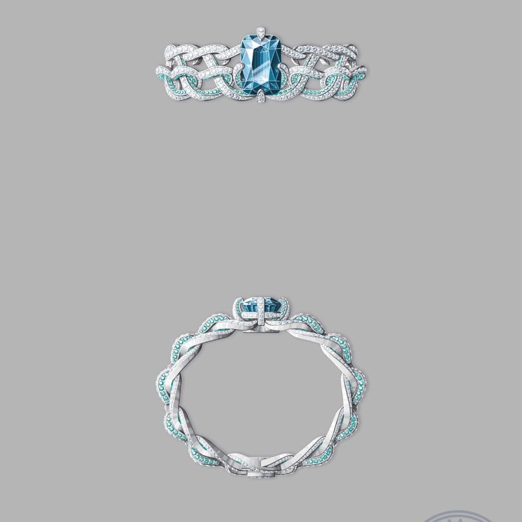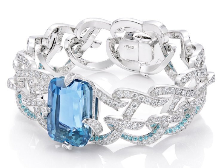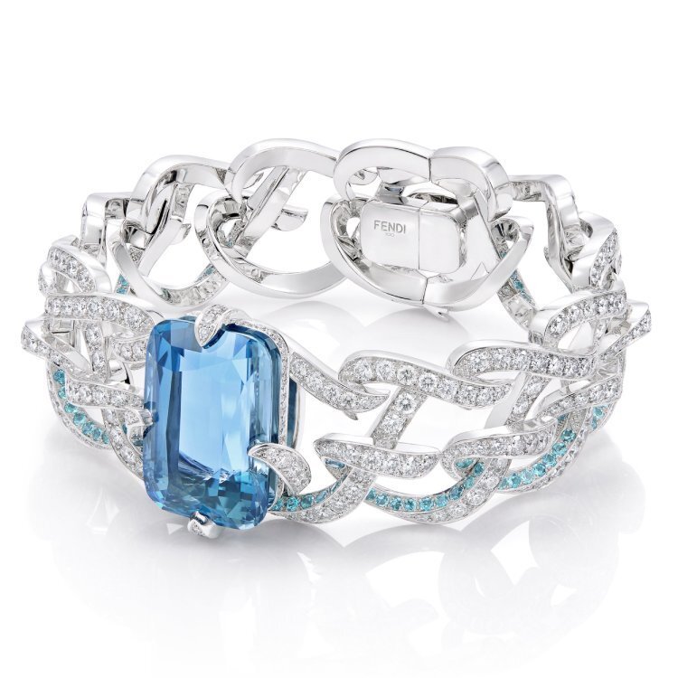 The set comprises a cocktail ring and a bracelet. Its most distinctive feature is that the bracelet band and ring shank are artfully crafted into links shaped like the cursive ‘F’ monogram, paying homage to the iconic FF logo hand-drawn by the brand’s late fashion designer, Karl Lagerfeld, in 1981. The winding and interlacing diamond lines resemble the elegant flow of water, with delicate accents of paraíba tourmalines adding a fresh and ethereal touch.