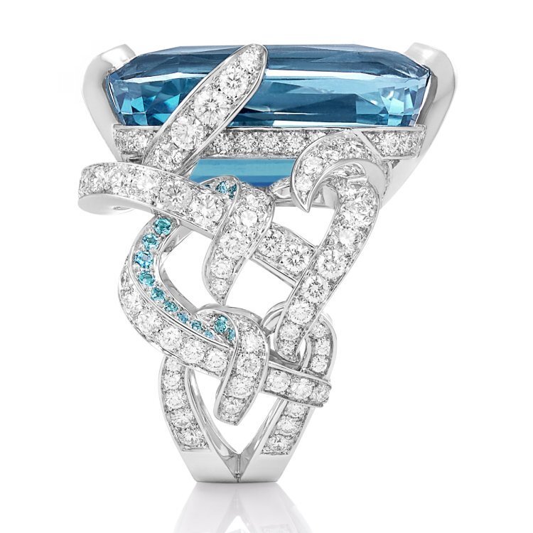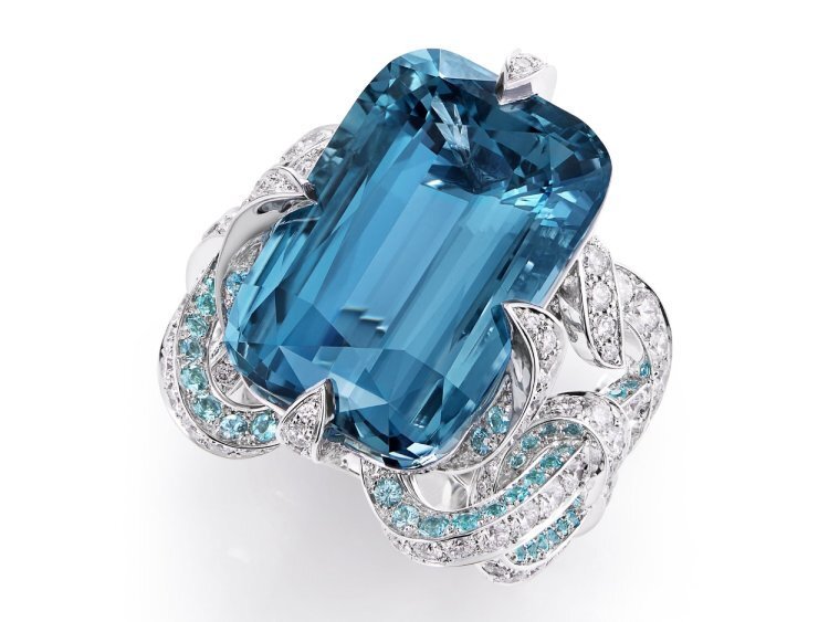 Each piece features a central, vibrant blue Santa Maria aquamarine, prized for its clarity and luminous color. The Santa Maria Aquamarine was initially discovered in Brazil’s Santa Maria de Itabira mine, from which it gets its name. These gems possess a medium-saturation blue reminiscent of sea water and represent the most valuable color grade for aquamarines.