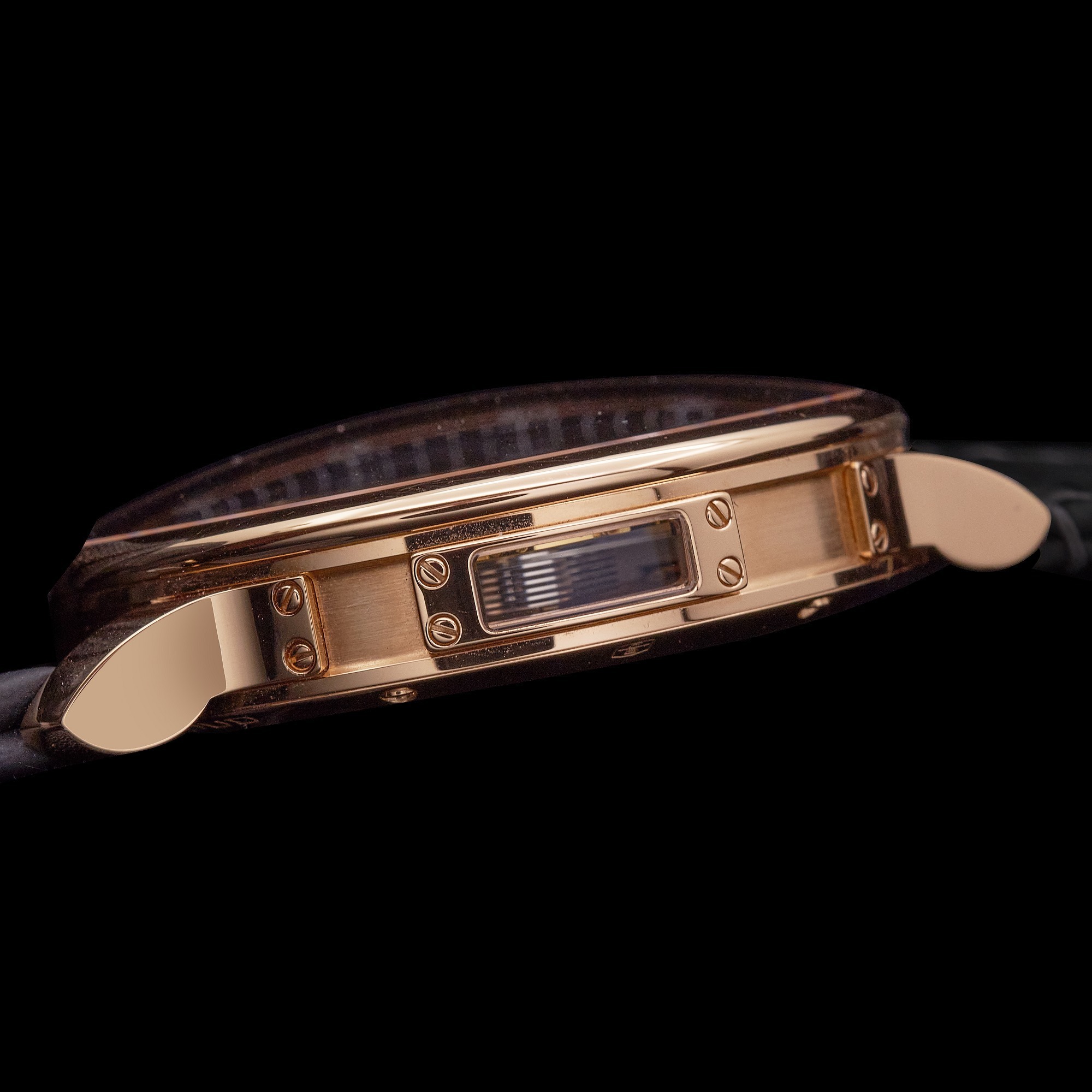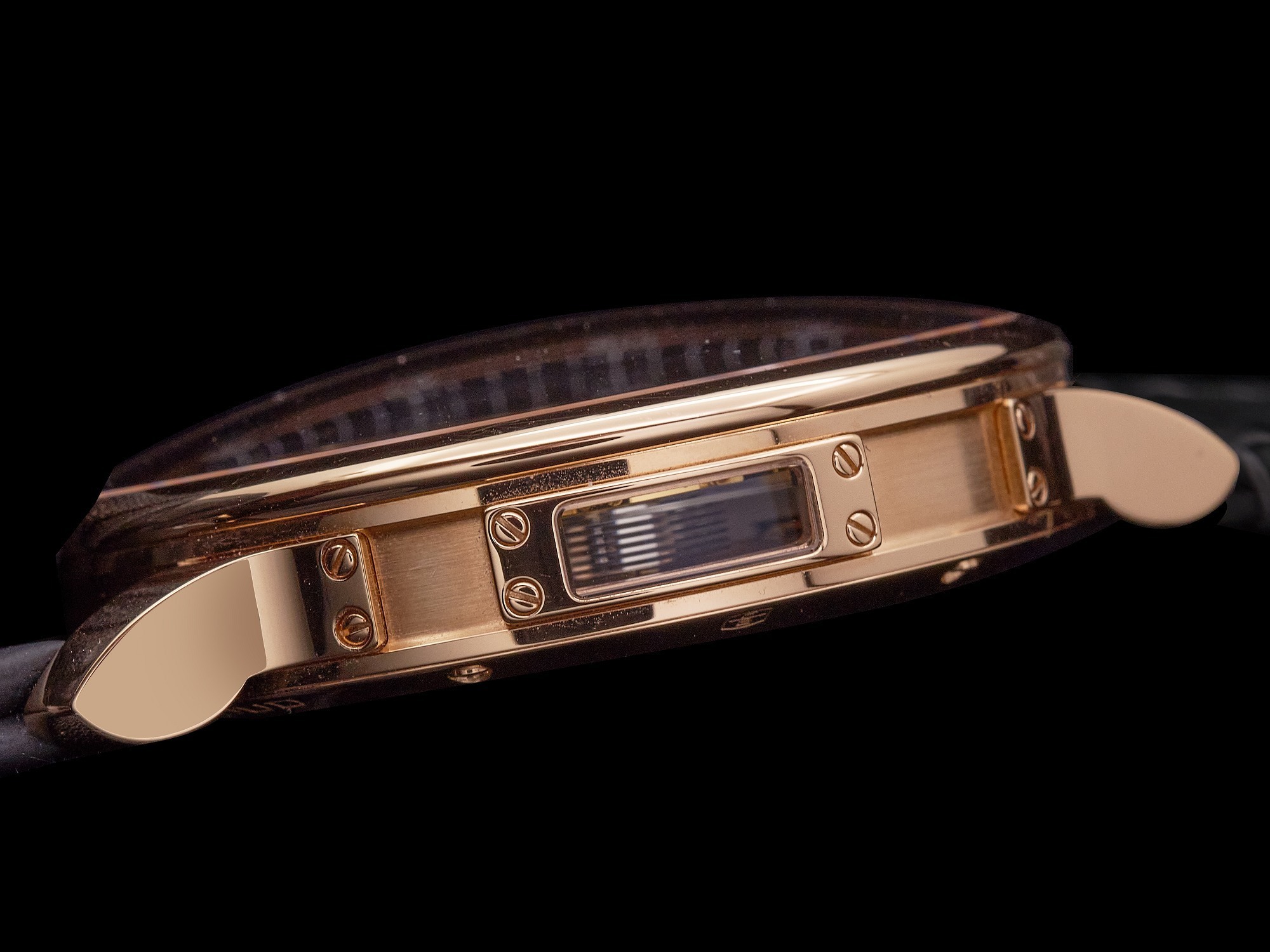 The 42 mm case, crafted in 18 K rose gold, measures only 9.43 mm thick and features a refined alternation of polished and satin-brushed finishes. A transparent sapphire “porthole” on the case flank at 9 o’clock offers a unique side view of the movement’s intricate architecture and operation.