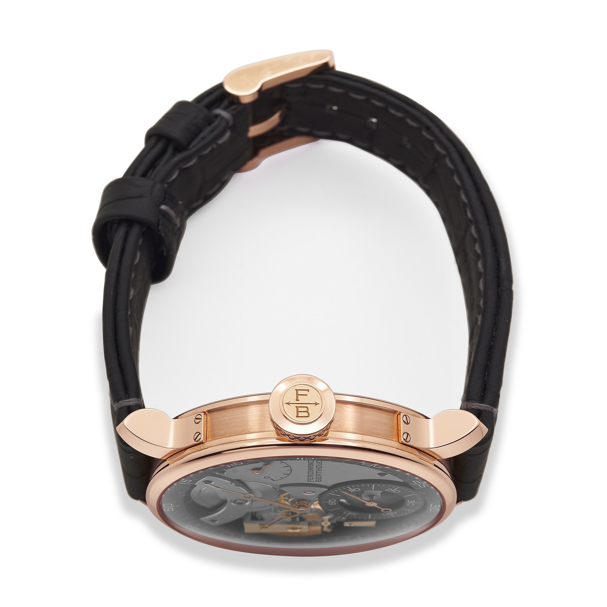 Case: 18 K rose gold, 42.3 mm × 9.43 mm,Crown: 18 K rose gold,Crystal: Sapphire,Dial: Rhodium-plated, open-worked,Hands: 18 K rose gold,Movement: FB-SPC hand-wound, 47 jewels, 21,600 vph, 72-hour power reserve,Strap: Alligator leather, pin buckle,Water resistance: 30 m.