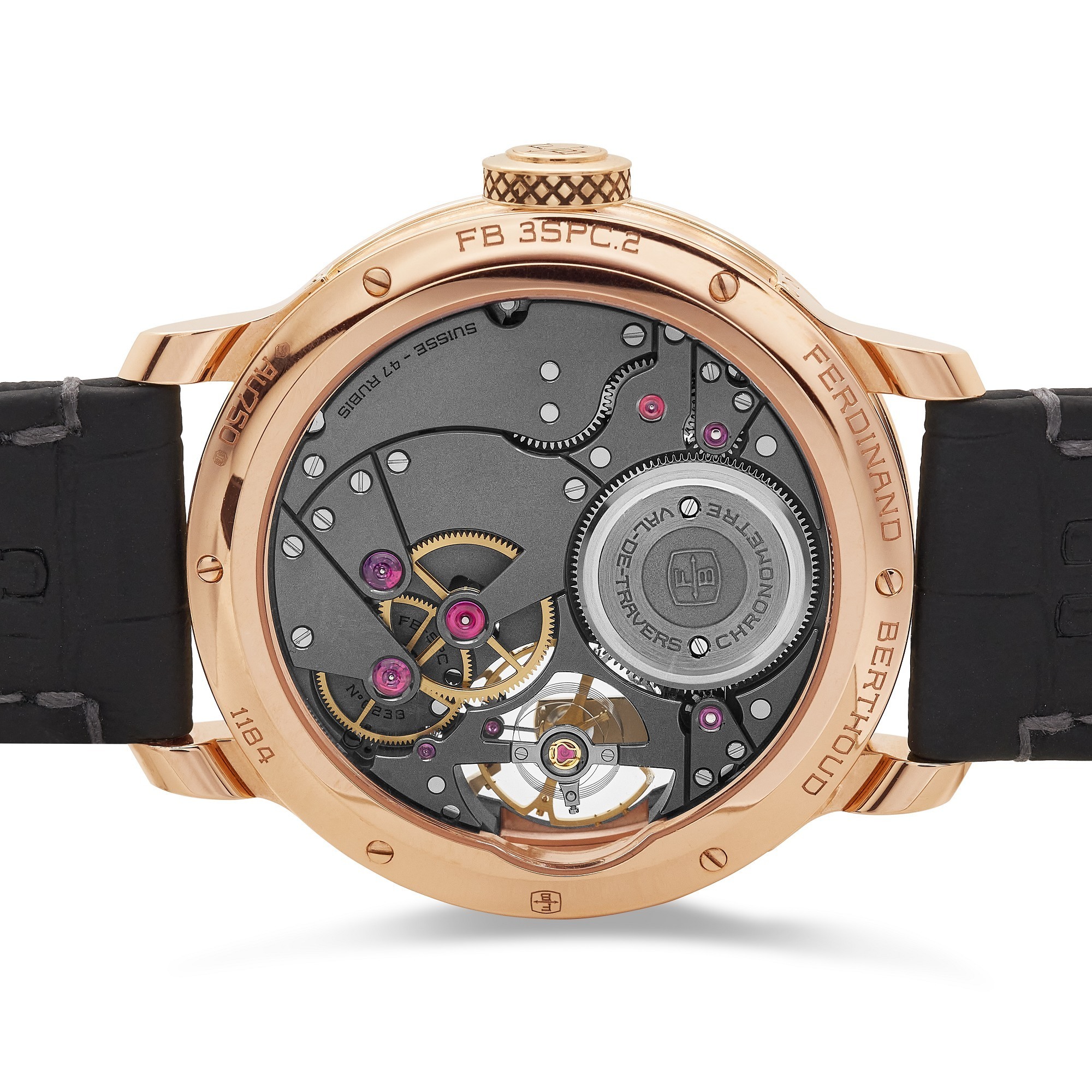 Powering the watch is the FB-SPC hand-wound movement, beating at 21,600 vph and delivering a 72-hour power reserve. Comprising 230 components, the movement alone requires more than 100 hours of polishing and finishing. The bridges feature a sandblasted and rhodium-plated dark-grey finish, exemplifying Ferdinand Berthoud’s uncompromising level of craftsmanship.