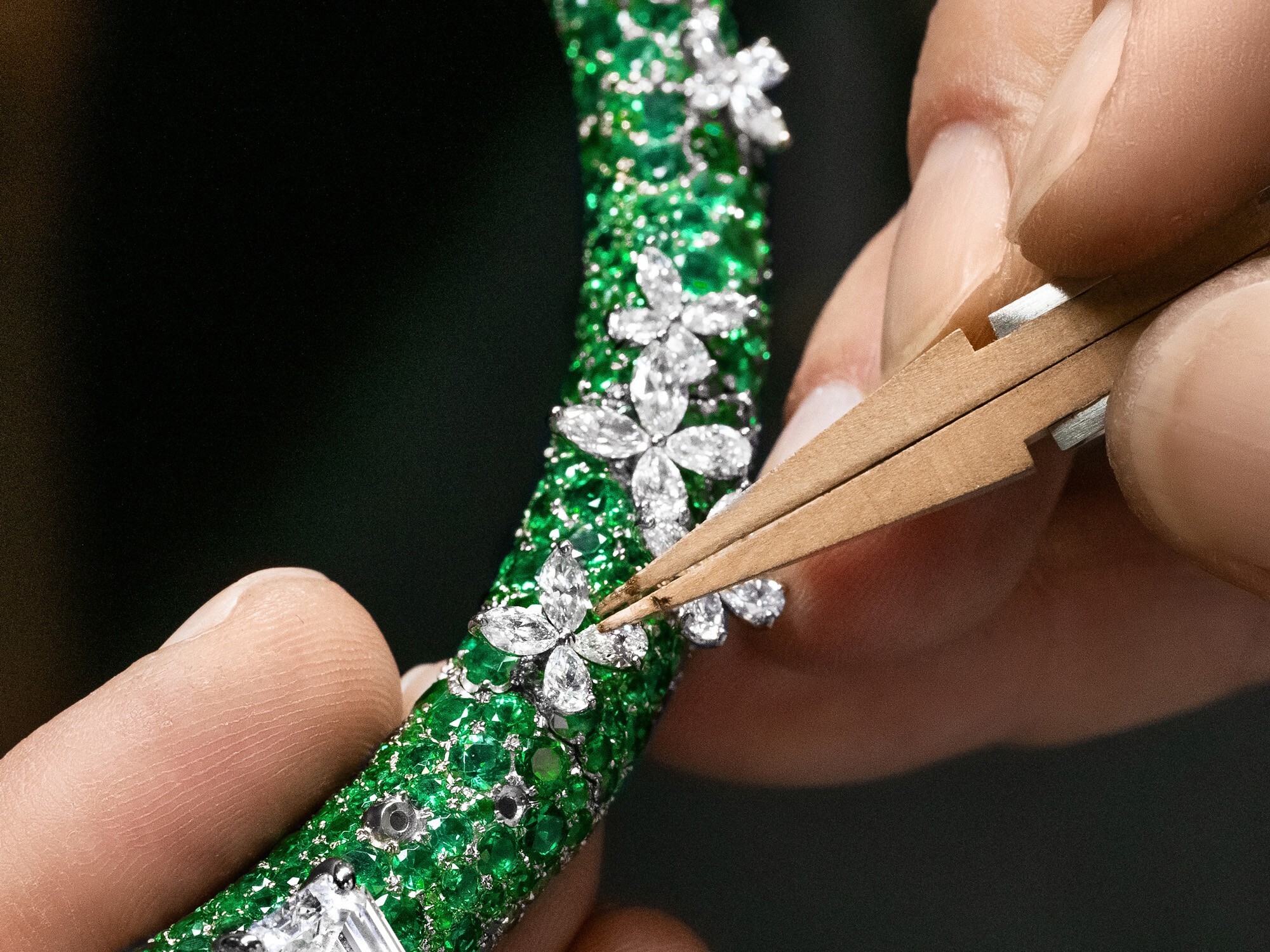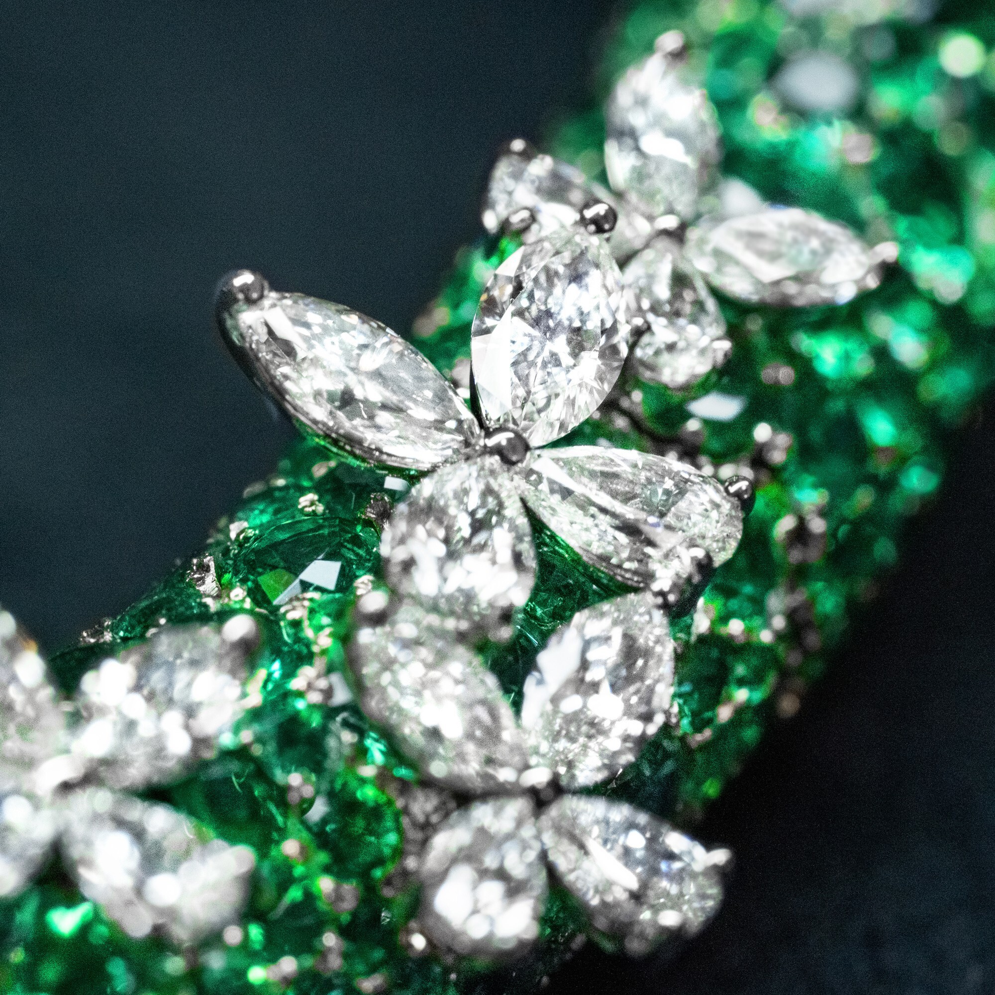 The butterfly, long emblematic of transformation, freedom, and beauty, serves as the creative muse for this piece. Inspired by the hidden wonders of nature, the necklace’s design features emeralds totaling 57.13 carats, pavé-set to form vivid green vines teeming with energy and motion. Among them, four butterflies are sculpted from pear-shaped and marquise-cut diamonds, each meticulously angled to capture light and convey a sense of graceful flight. The butterflies appear to alight gently upon the emerald vines, creating a poetic, romantic tableau.