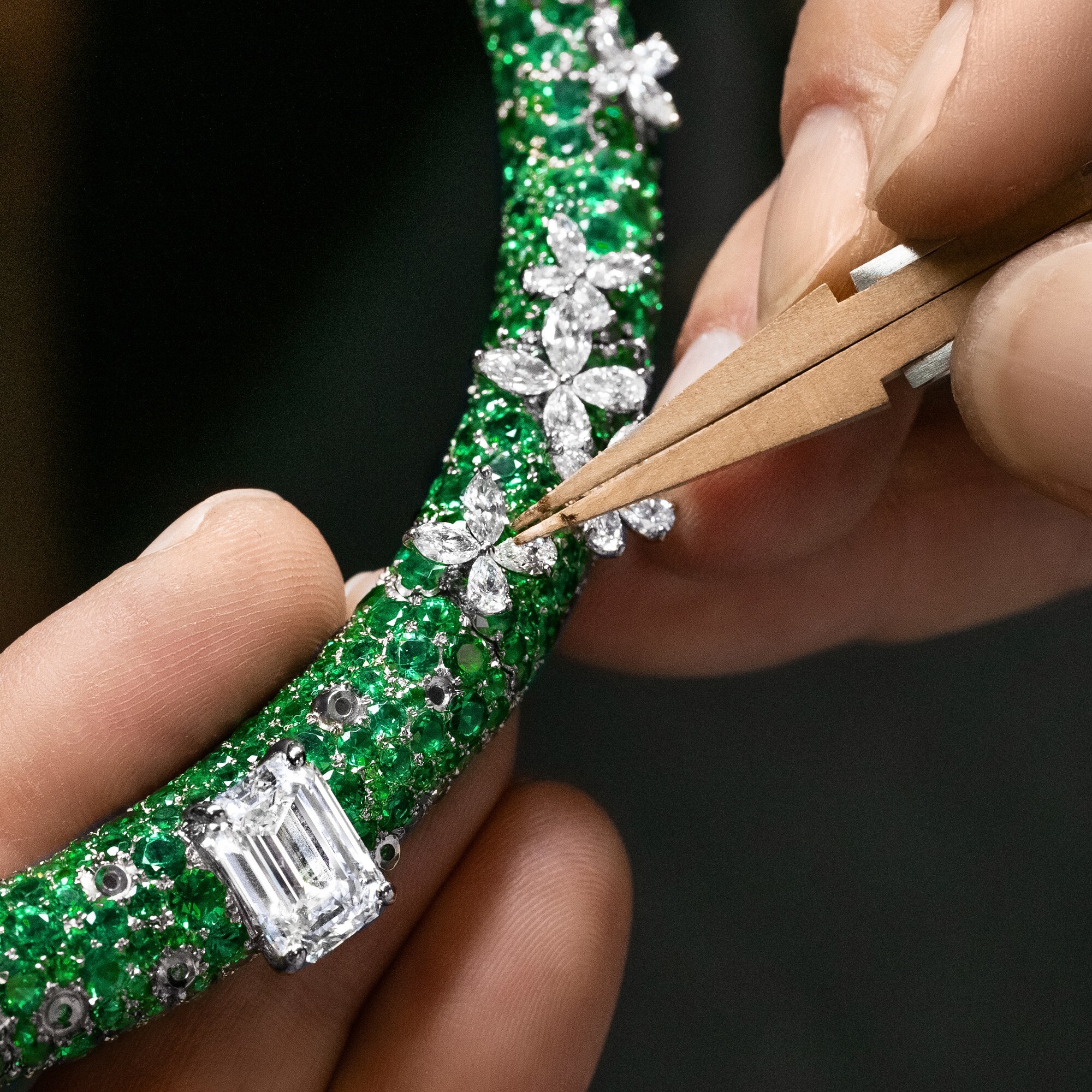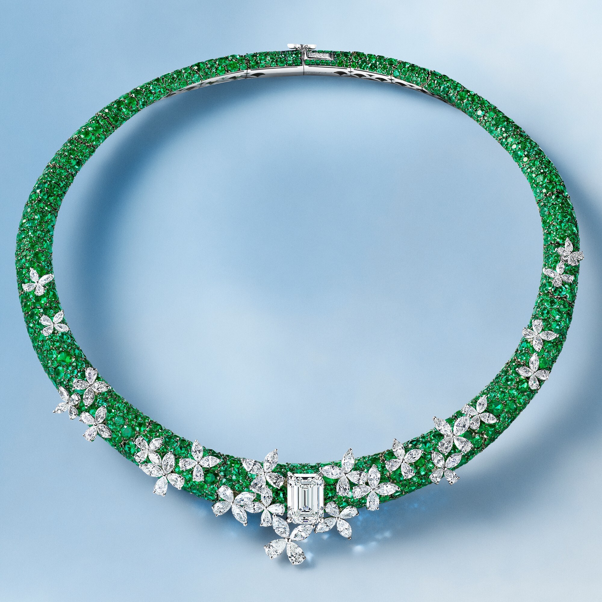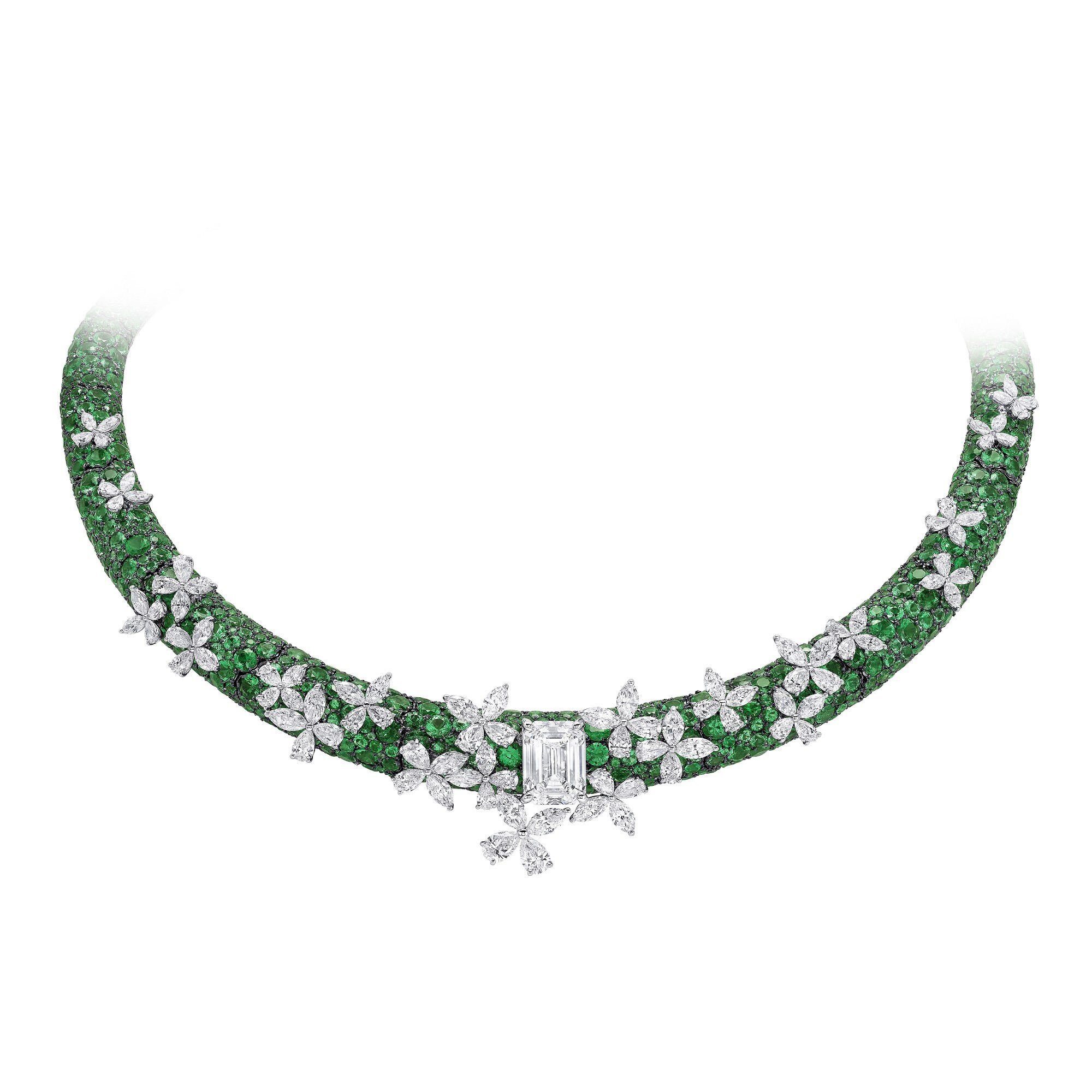To celebrate the 50th anniversary of the Butterfly collection, Graff presents this exceptional high jewelry necklace. The design gracefully weaves the brand’s signature diamond butterfly motif into a lush emerald-set necklace, evoking the beauty and vitality of nature. At its heart lies a 5.04-carat emerald-cut diamond, radiating brilliance and purity—a symbol of vibrant life and renewal.