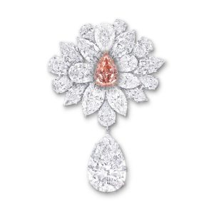 Completing the composition, a 38.13-carat D-color, flawless pear-shaped diamond dangles gracefully at the base of the brooch, echoing the central pink diamond and adding a dazzling sense of movement and brilliance.
