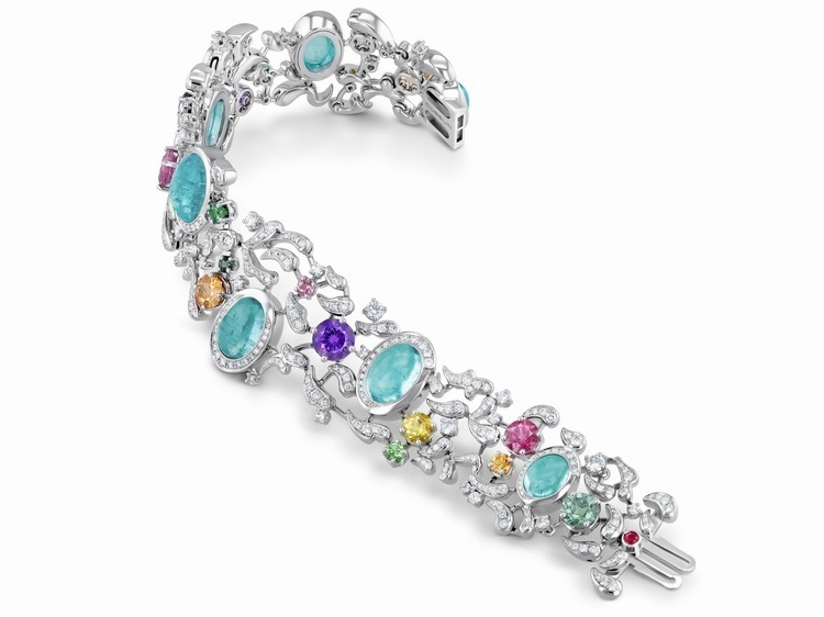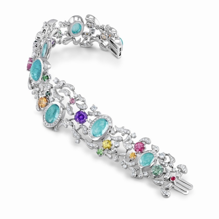 • A bracelet with a streamlined silhouette, set with seven Paraiba tourmalines ranging from 2.01 to 6 carats—marking Gübelin’s first-ever bracelet design.