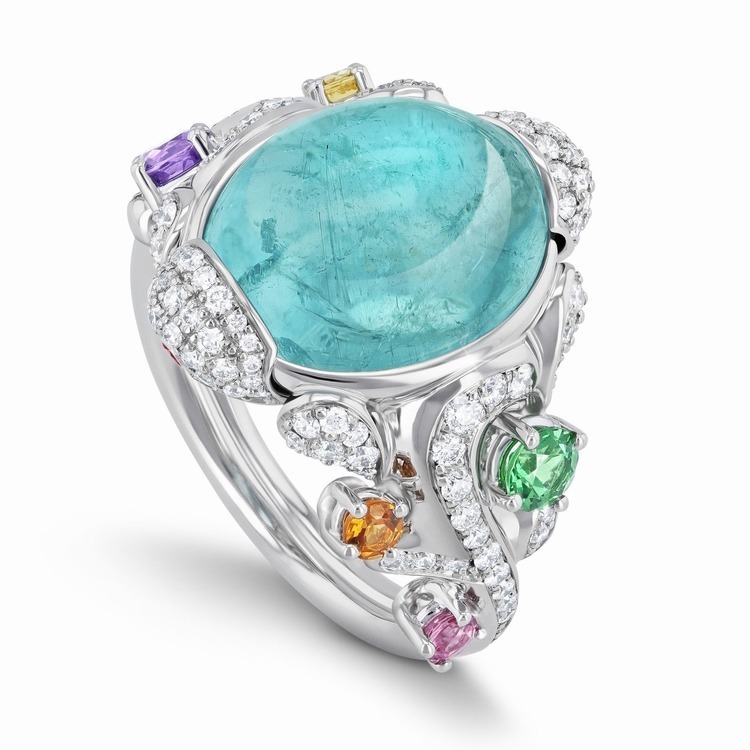 • A ring centered on a 7.65-carat Paraiba tourmaline, perfectly embodying the sea anemone theme.