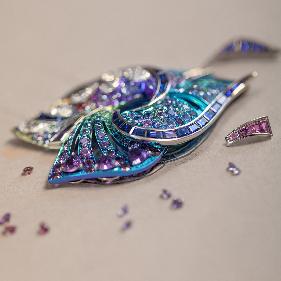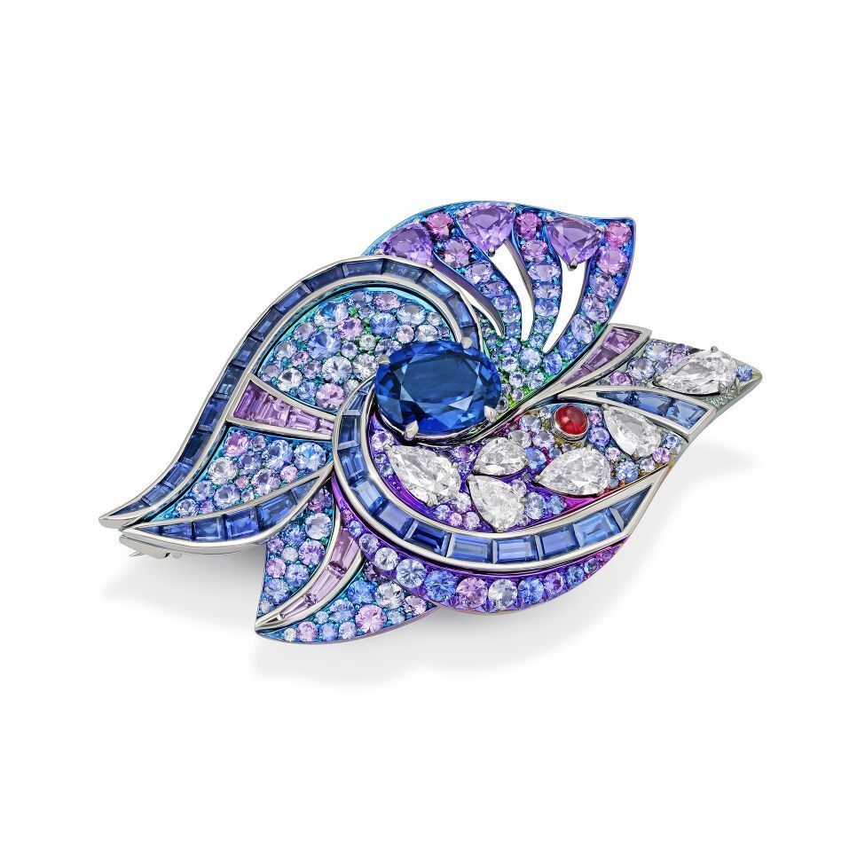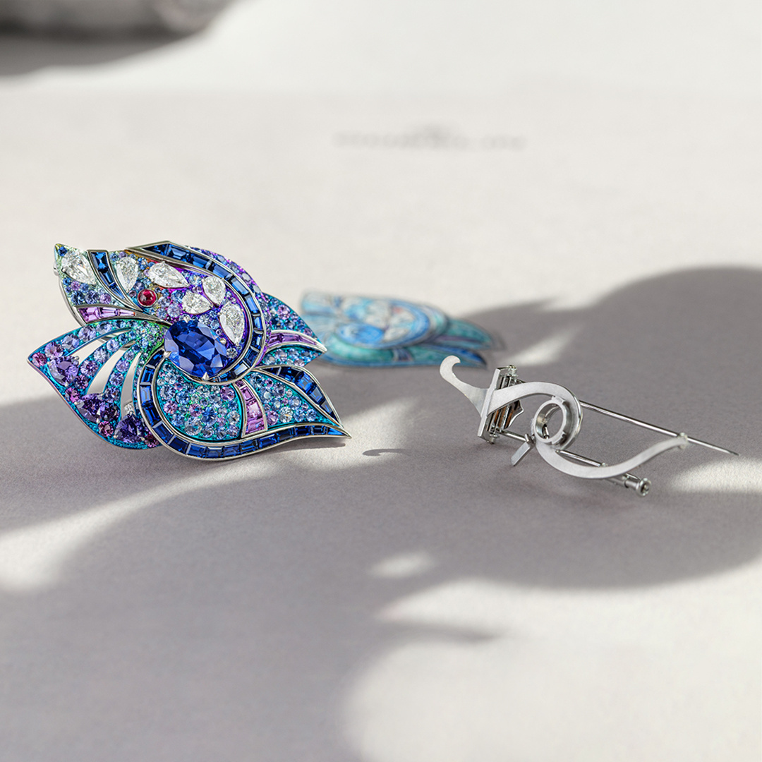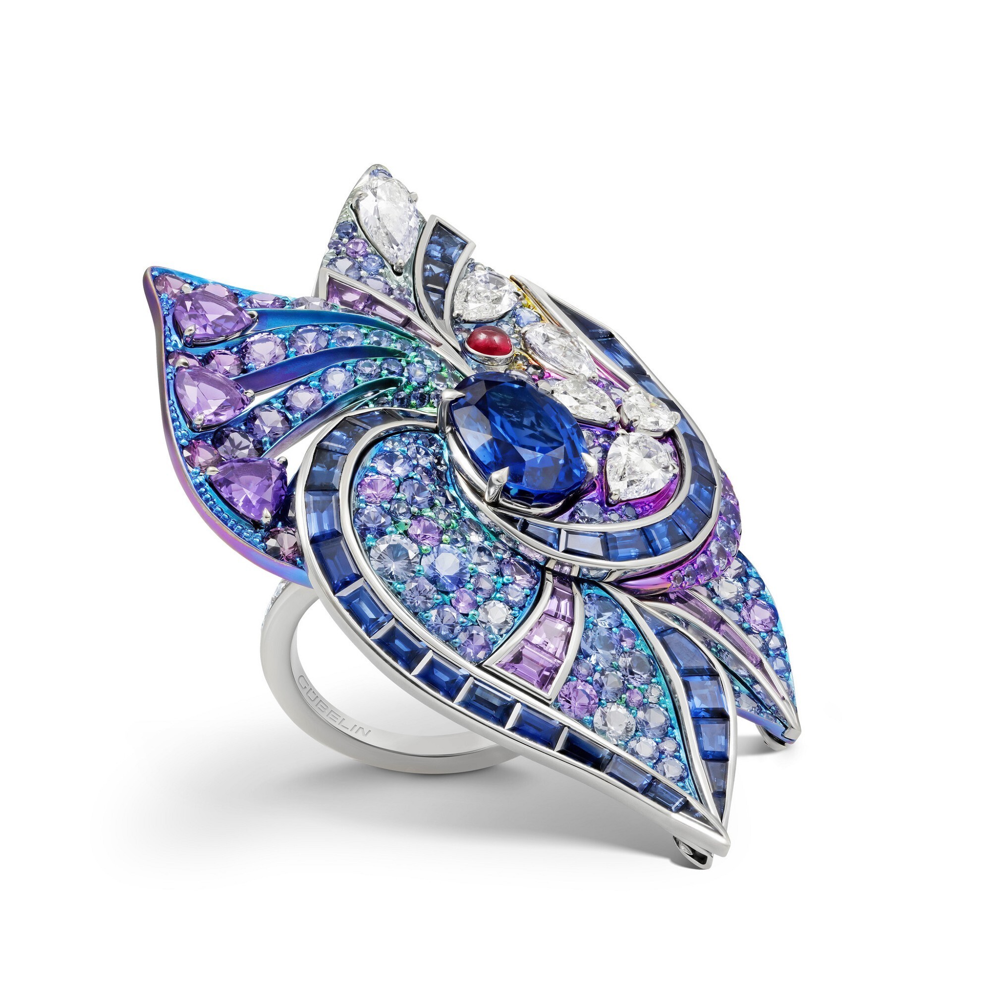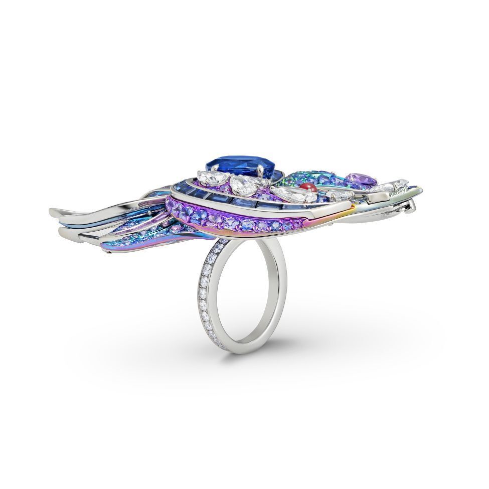 Gübelin crafted this jewel in titanium, a choice that makes it exceptionally light while amplifying the color vibrancy of the wings. The wings are set with over 226 blue and violet sapphires; the left wing, coated in an iridescent purple titanium finish, blends seamlessly with the stones, while the right wing sparkles with six pear-shaped diamonds and a cabochon ruby accent, adding brilliance and vitality to the composition.