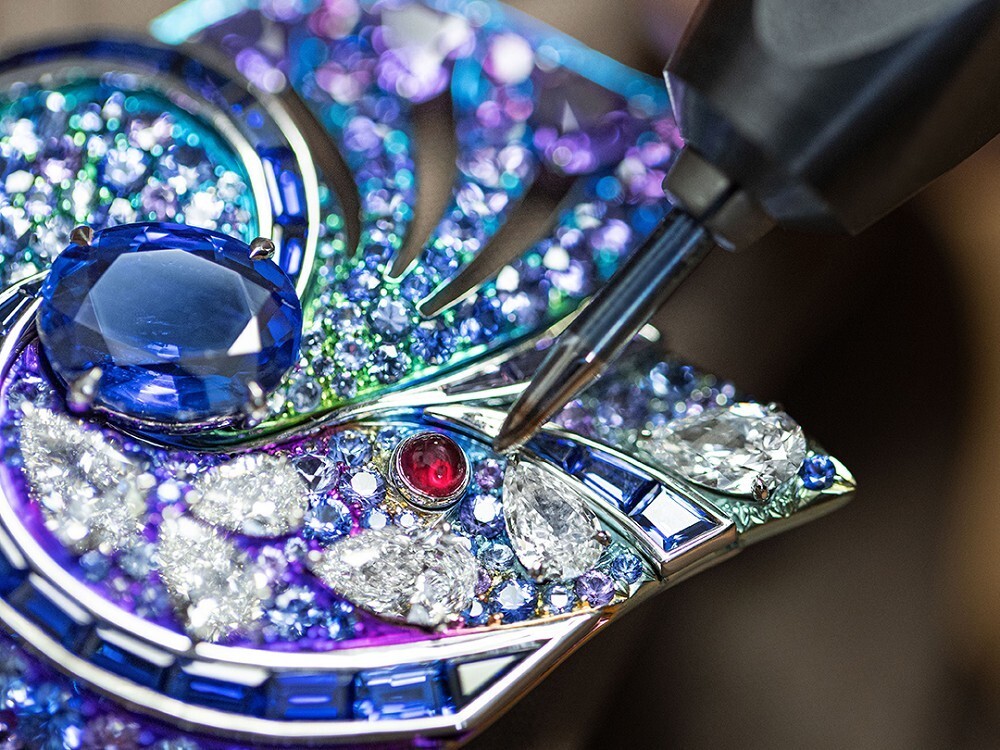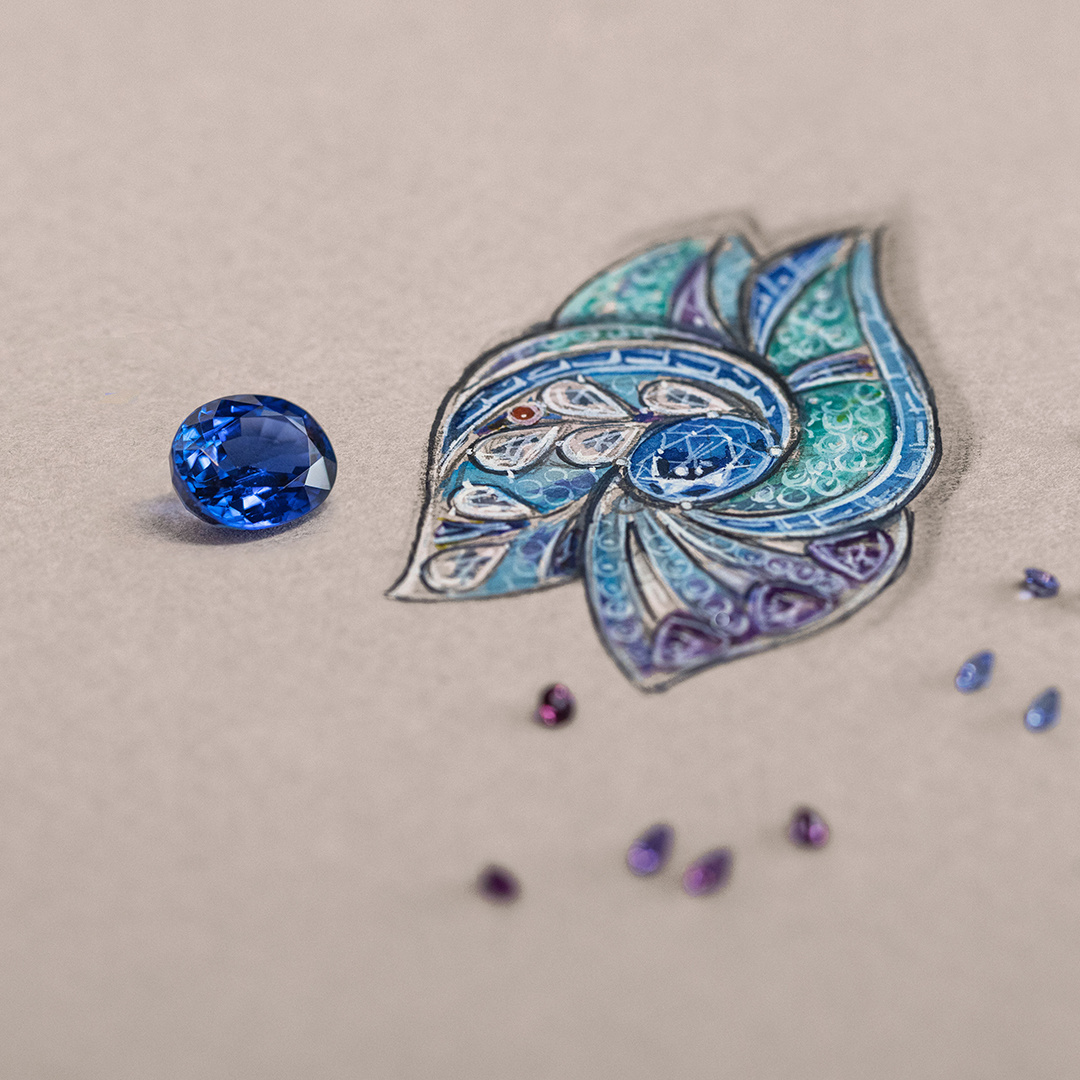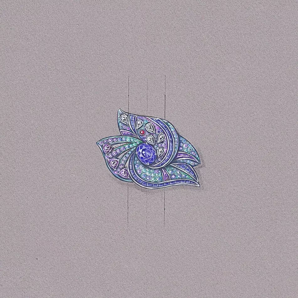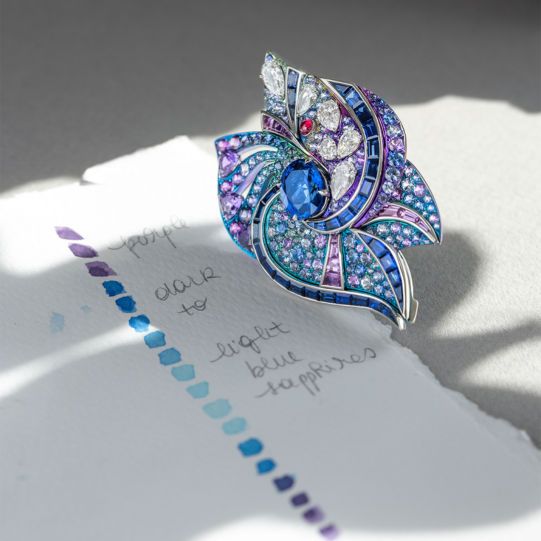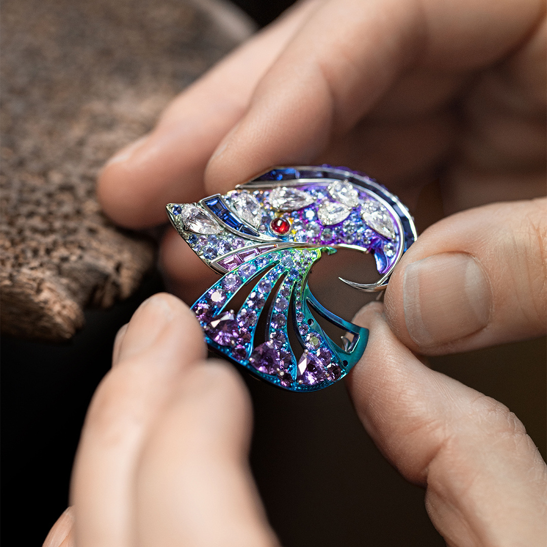 Gübelin crafted this jewel in titanium, a choice that makes it exceptionally light while amplifying the color vibrancy of the wings. The wings are set with over 226 blue and violet sapphires; the left wing, coated in an iridescent purple titanium finish, blends seamlessly with the stones, while the right wing sparkles with six pear-shaped diamonds and a cabochon ruby accent, adding brilliance and vitality to the composition.