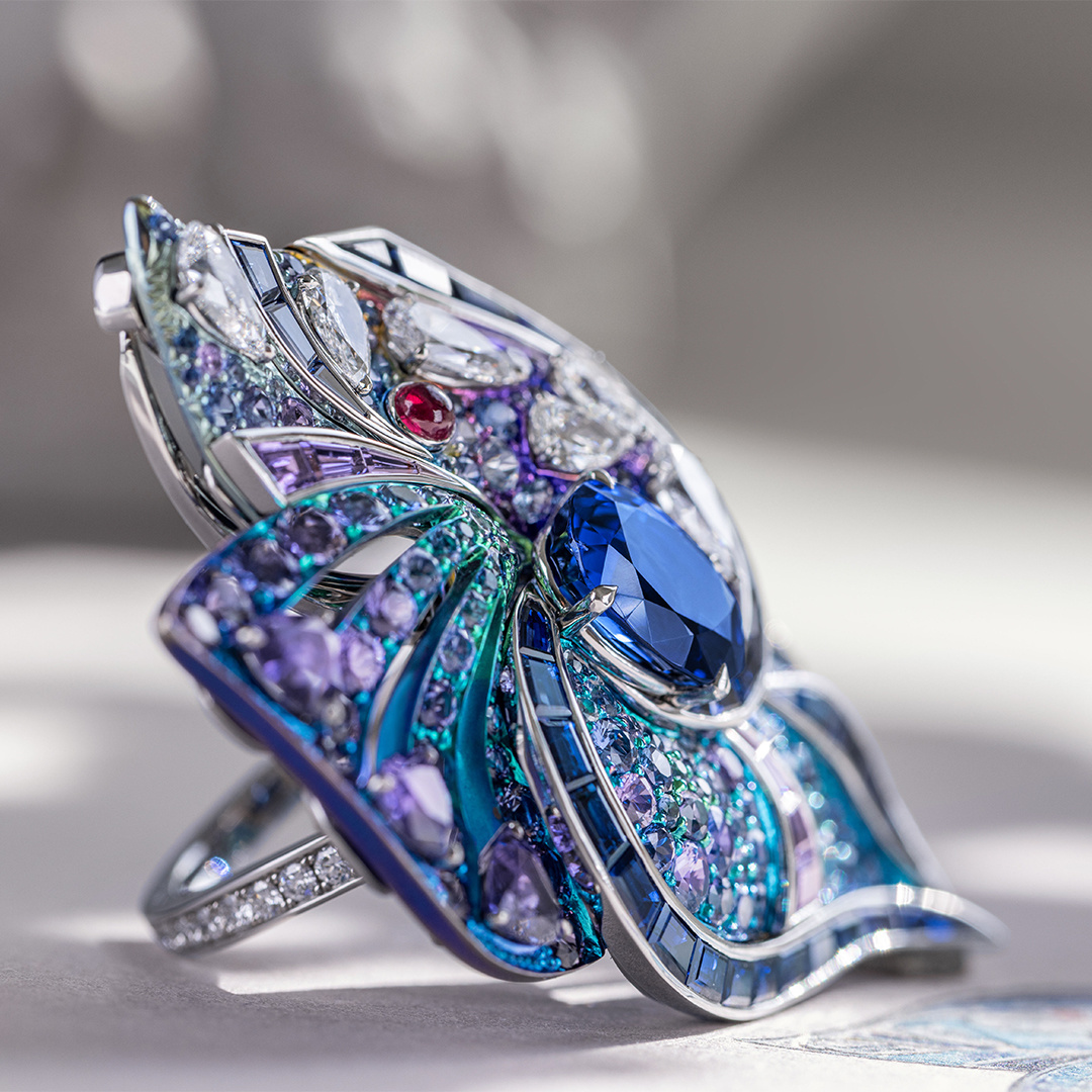 This “Vibrant Wings” sapphire ring is a one-of-a-kind creation by the Swiss jeweler Gübelin, inspired by the natural inclusions within Burmese sapphires. The designer reinterprets the gemstone’s internal microstructures into a pair of butterfly wings, using graduated blue and violet sapphires to accentuate the central stone — evoking the dazzling sight of a butterfly fluttering gracefully in sunlight.