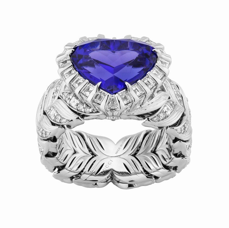 A white gold ring set with a 7.52-carat blue-violet tanzanite, evocative of the depth and tranquility of winter.