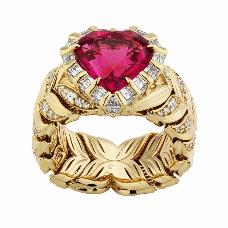 The band’s design resembles a wreath woven from laurel leaves. Brilliant-cut diamonds are set between the laurel leaves, creating a sparkling and dynamic visual effect. The central gemstone setting is surrounded by baguette-cut diamonds, forming a three-dimensional, light-penetrating suspended structure that enhances the brightness and clarity of the gemstone’s color.