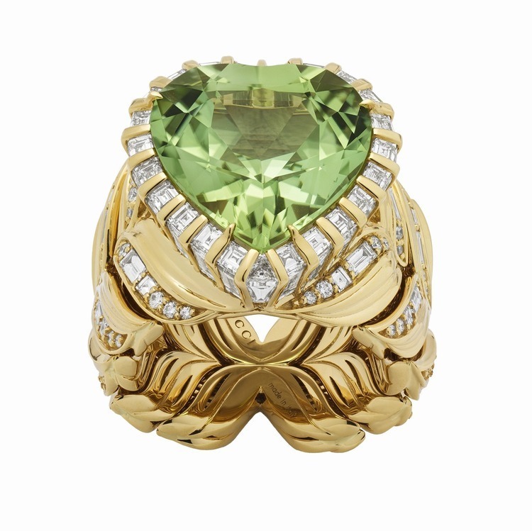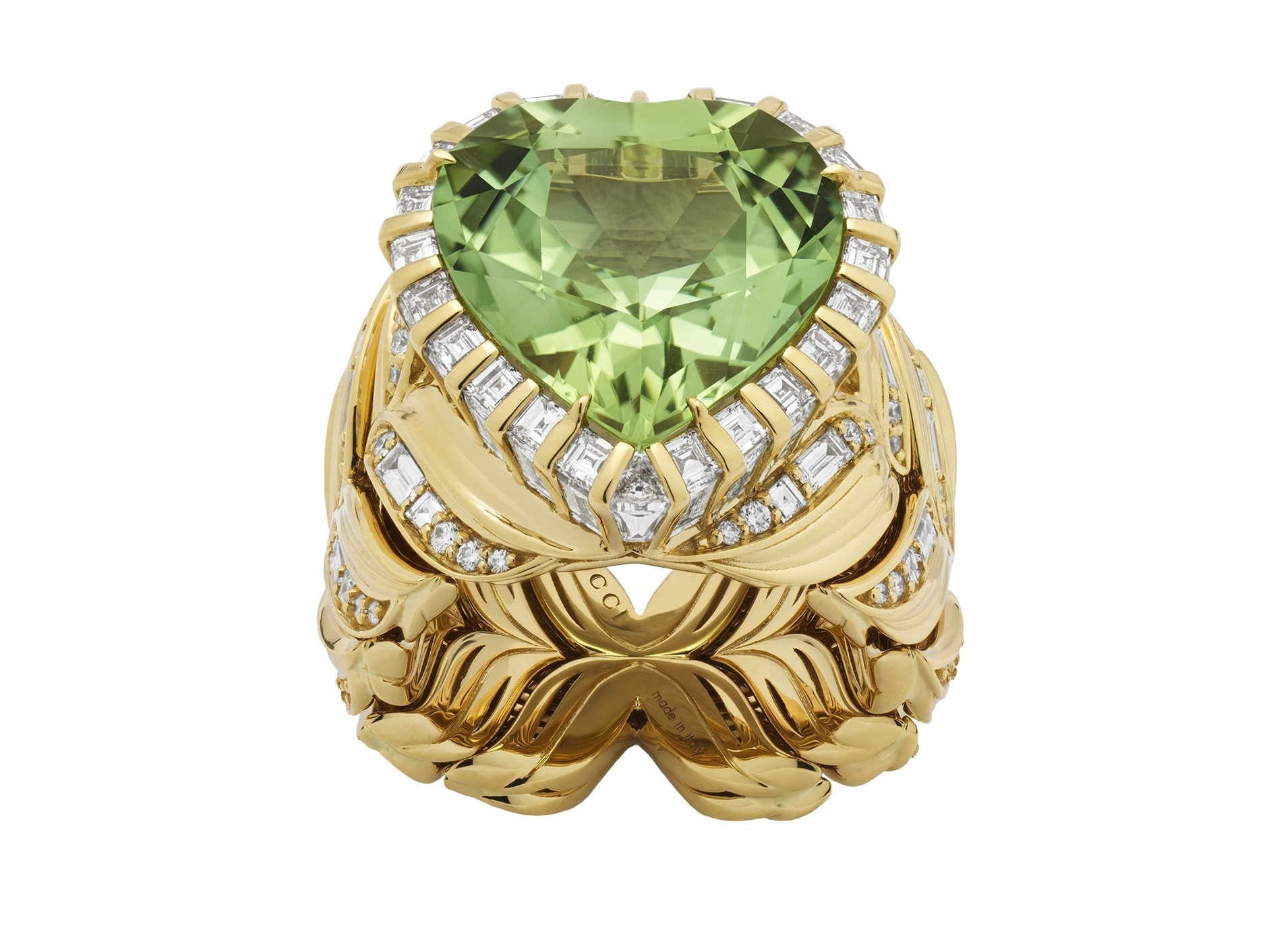 A yellow gold ring set with a 16.07-carat mint green tourmaline, reminiscent of newborn spring buds.