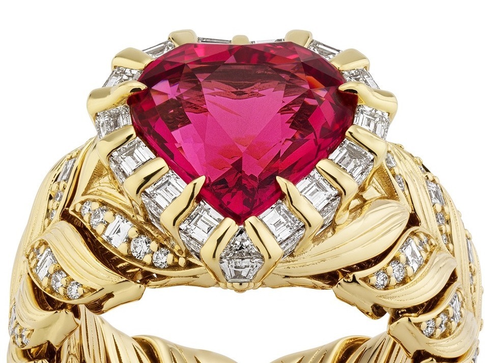 A rose gold ring set with a 5.3-carat red spinel, expressing a passionate and exuberant summer aura.