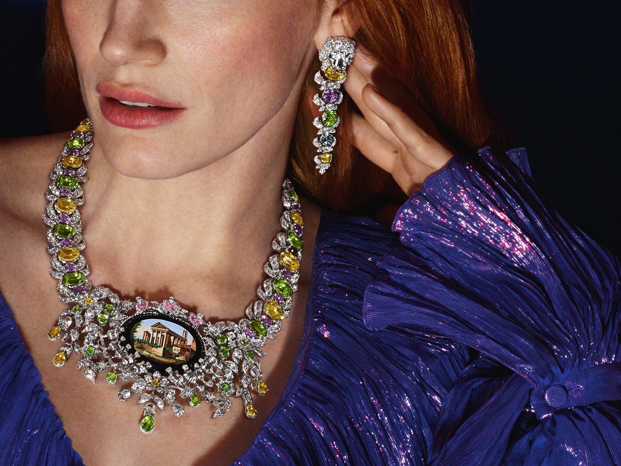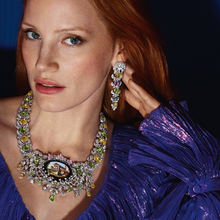 Gucci introduced this unique necklace piece in its 2022 new High Jewelry collection, “Hortus Deliciarum.” Its inspiration is drawn from the Renaissance tradition of the “Grand Tour,” with the highlight being the incorporation of an antique micromosaic plaque, complemented by a variety of colored gemstones. It invites the wearer on a journey across time and space, strolling through Italy’s renowned historical sites.