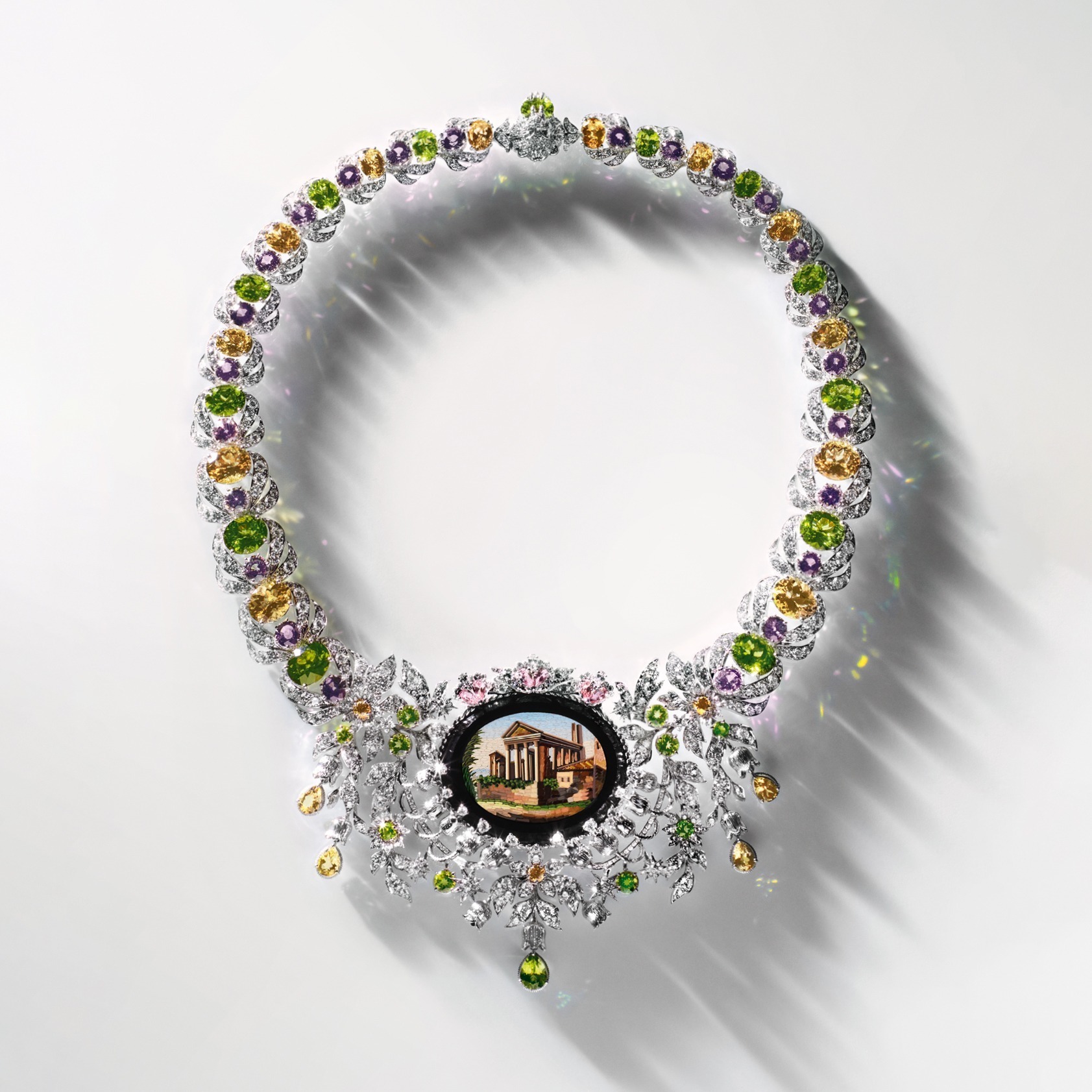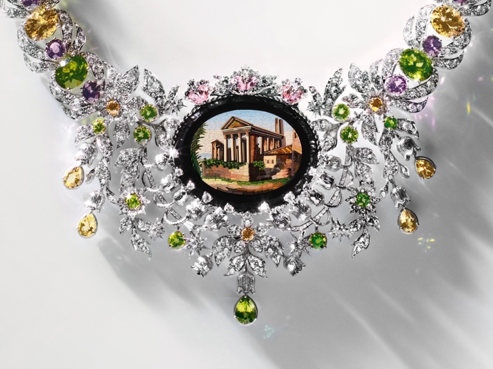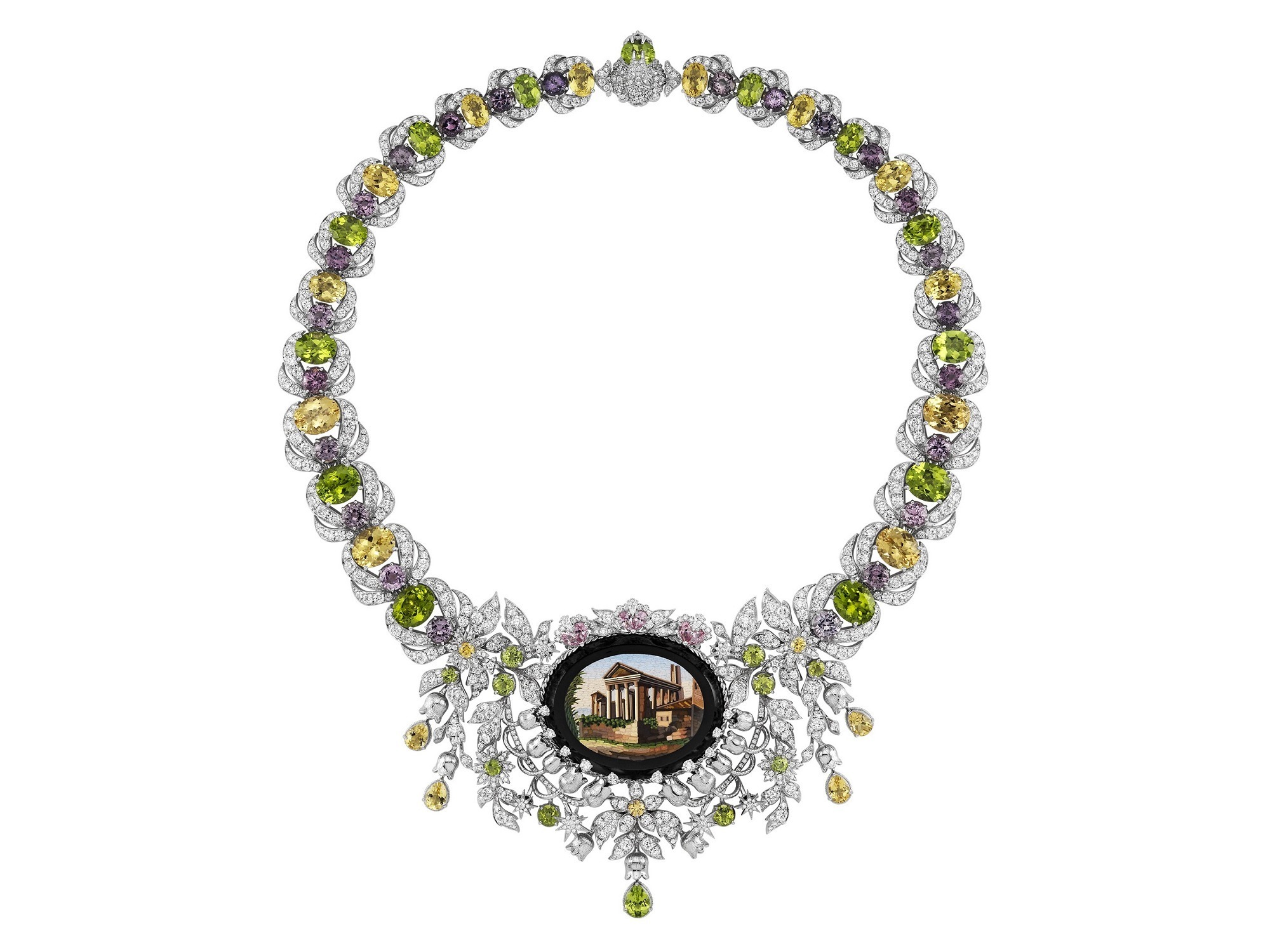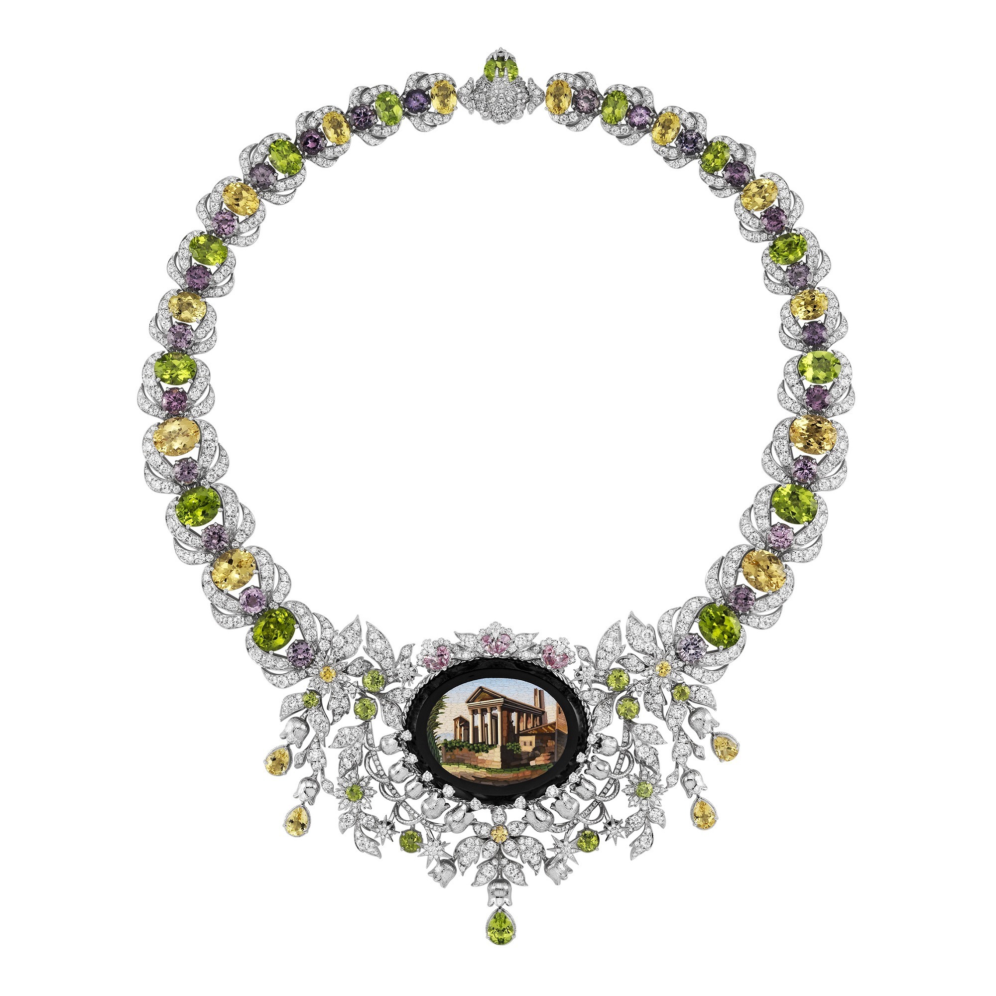The entire necklace is crafted from white gold, forming intricate flowers and vines that cluster around the antique micromosaic. The sides of the necklace are adorned with large heliodor, pink spinel, and peridot, their bright and lively colors creating a unique natural ambiance, reinvigorating the Italian historic site with vitality.