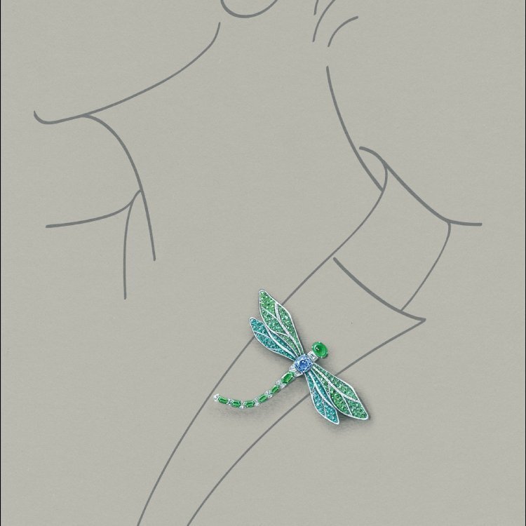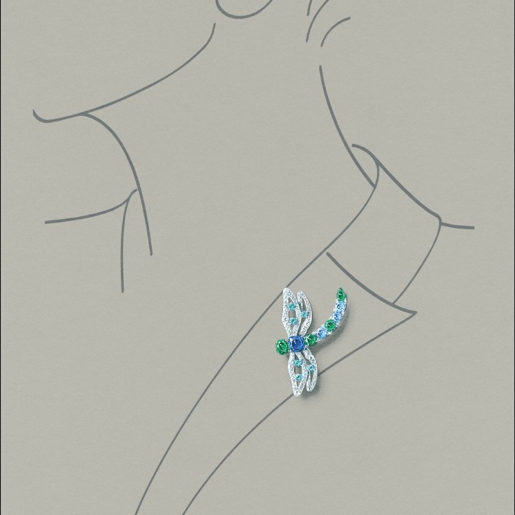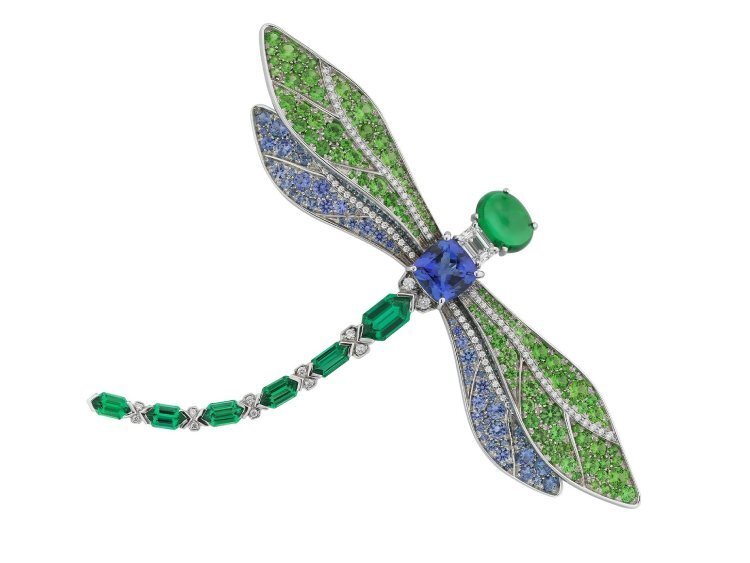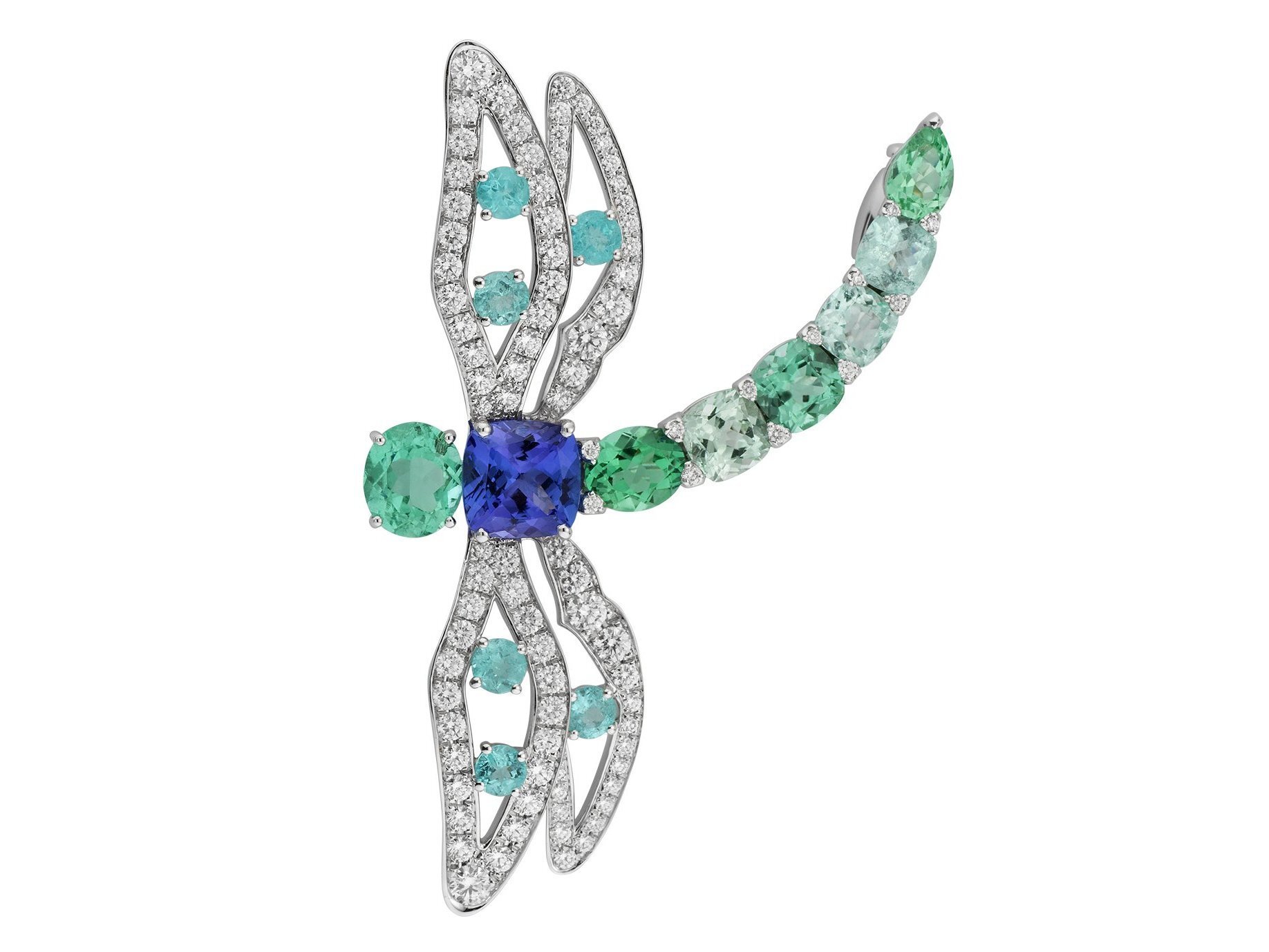 The most intricate piece, a brooch, features a cabochon-cut emerald as the dragonfly’s head. Its body connects a step-cut diamond and a 1.38-carat cushion-cut tanzanite, extending into six graduated emeralds that form the slender abdomen. The wings are paved with tanzanites and green tourmalines, the vivid blue-green tones harmonizing with the body and creating a sparkling effect.