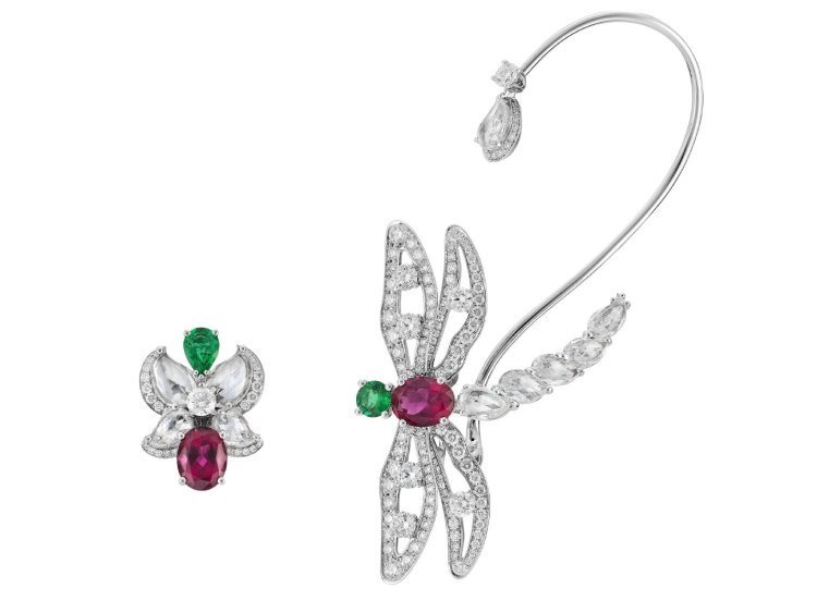 The earrings feature an asymmetrical design. On one side, a white gold structure following the contour of the ear extends into a diamond dragonfly, with emerald and red spinel forming the head and body, complemented by a rose-cut diamond tail. On the other side, emeralds, spinels, and rose-cut diamonds form a floral motif, evoking the serene scene of a dragonfly resting among flowers.